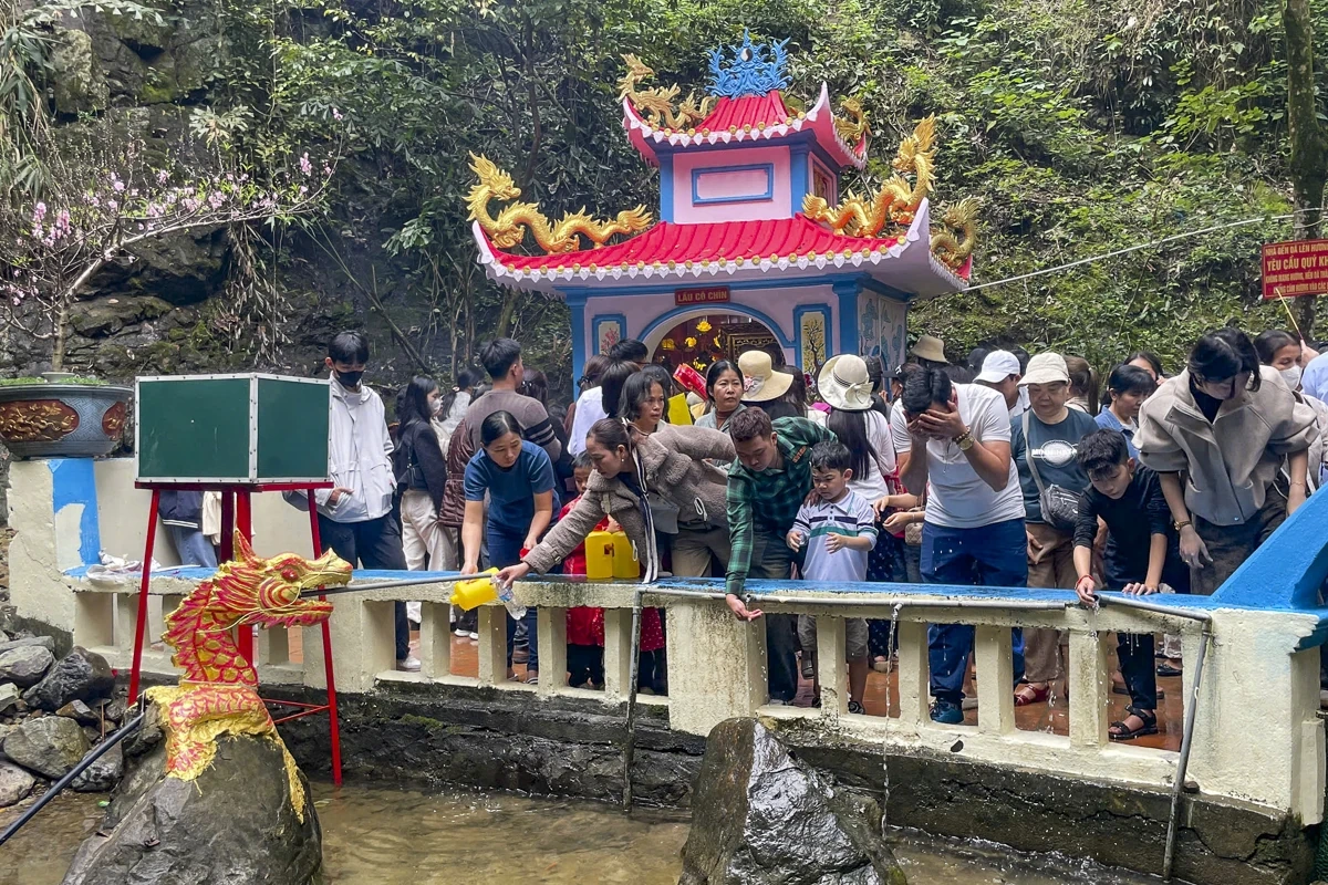 Chị Vũ Hoàng Anh (Hà Nội) chia sẻ, năm nay khu đền phủ được trang hoàng rực rỡ hơn, nhiều tiểu cảnh xuân được dựng công phu. “Người đông nhưng không khí rất vui. Đầu năm ai cũng mong khởi đầu suôn sẻ, nên sẵn sàng chờ để được chạm tay vào dòng nước thiêng ở Na Sơn”, chị nói.