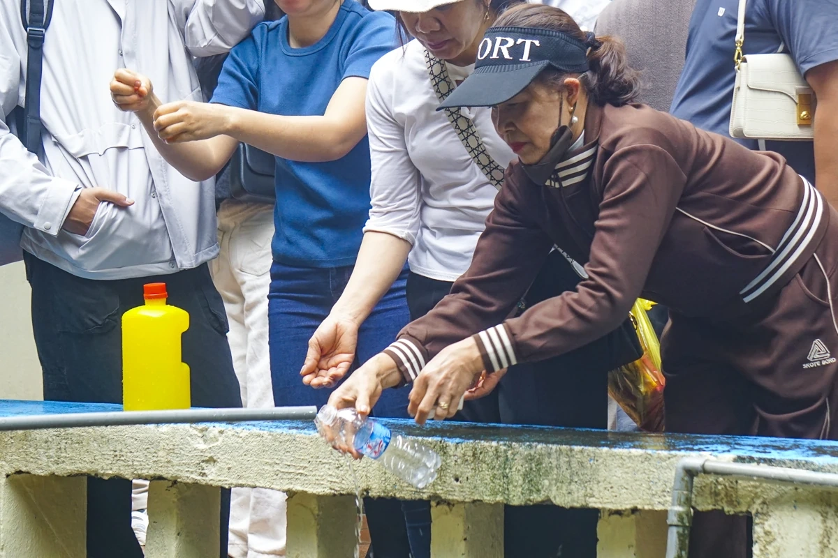 Nhiều người tranh thủ xin một chai nước nhỏ mang về “lấy lộc” theo quan niệm dân gian.