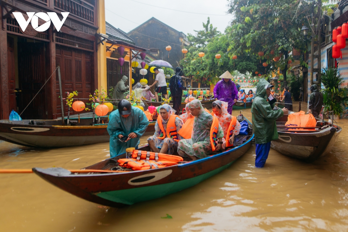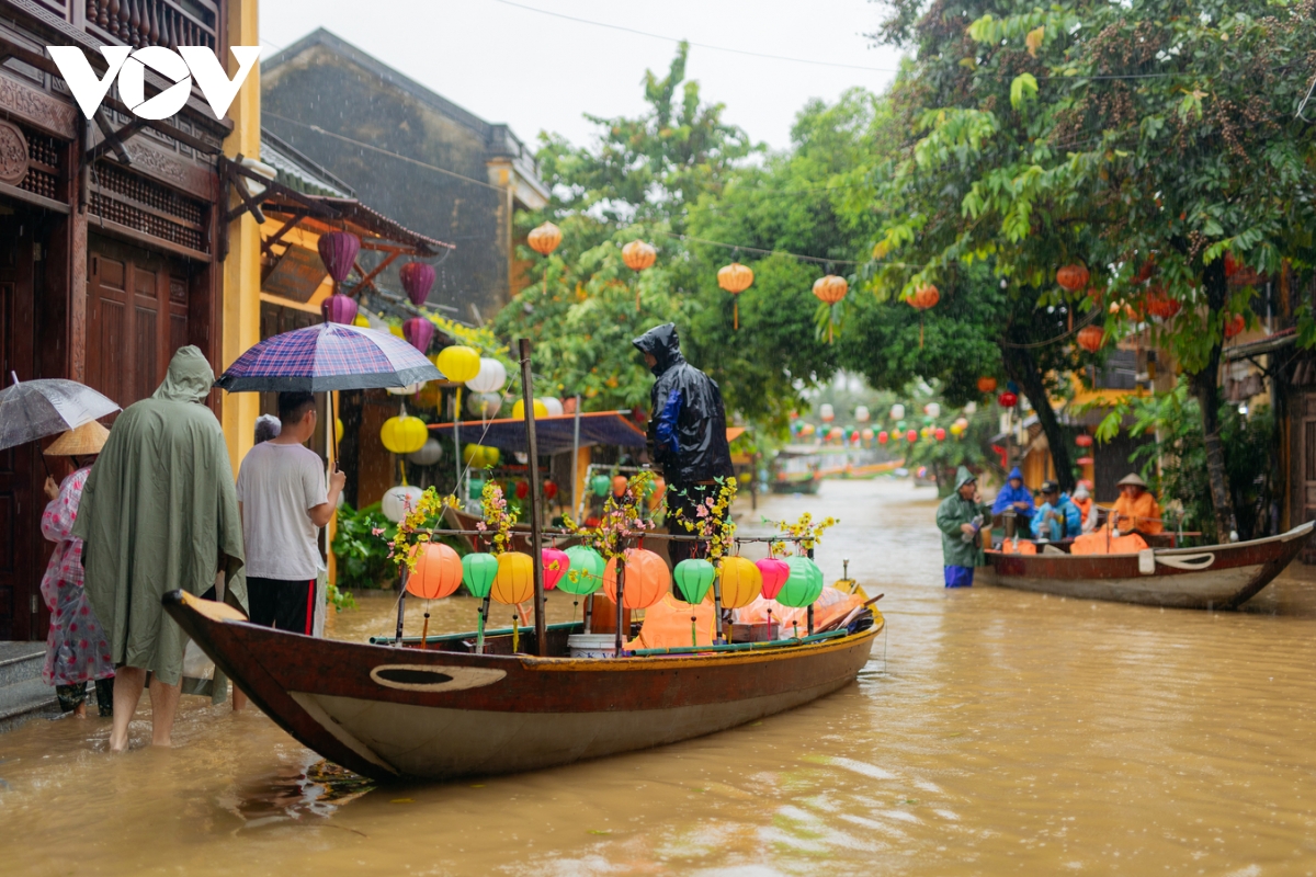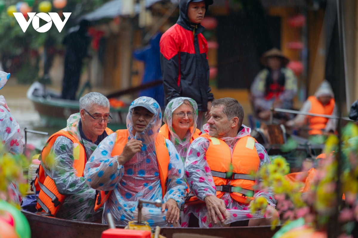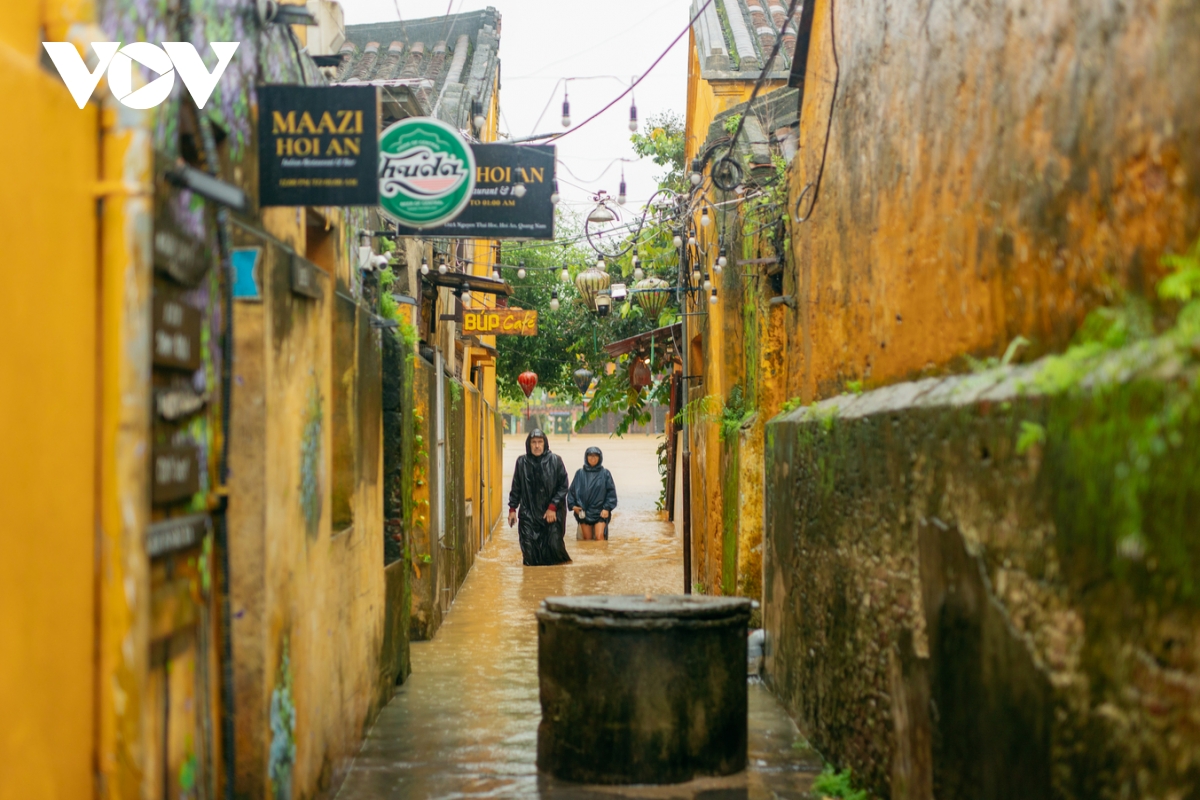 Khách nước ngoài thích thú đi lại trên phố cổ khi lũ về
