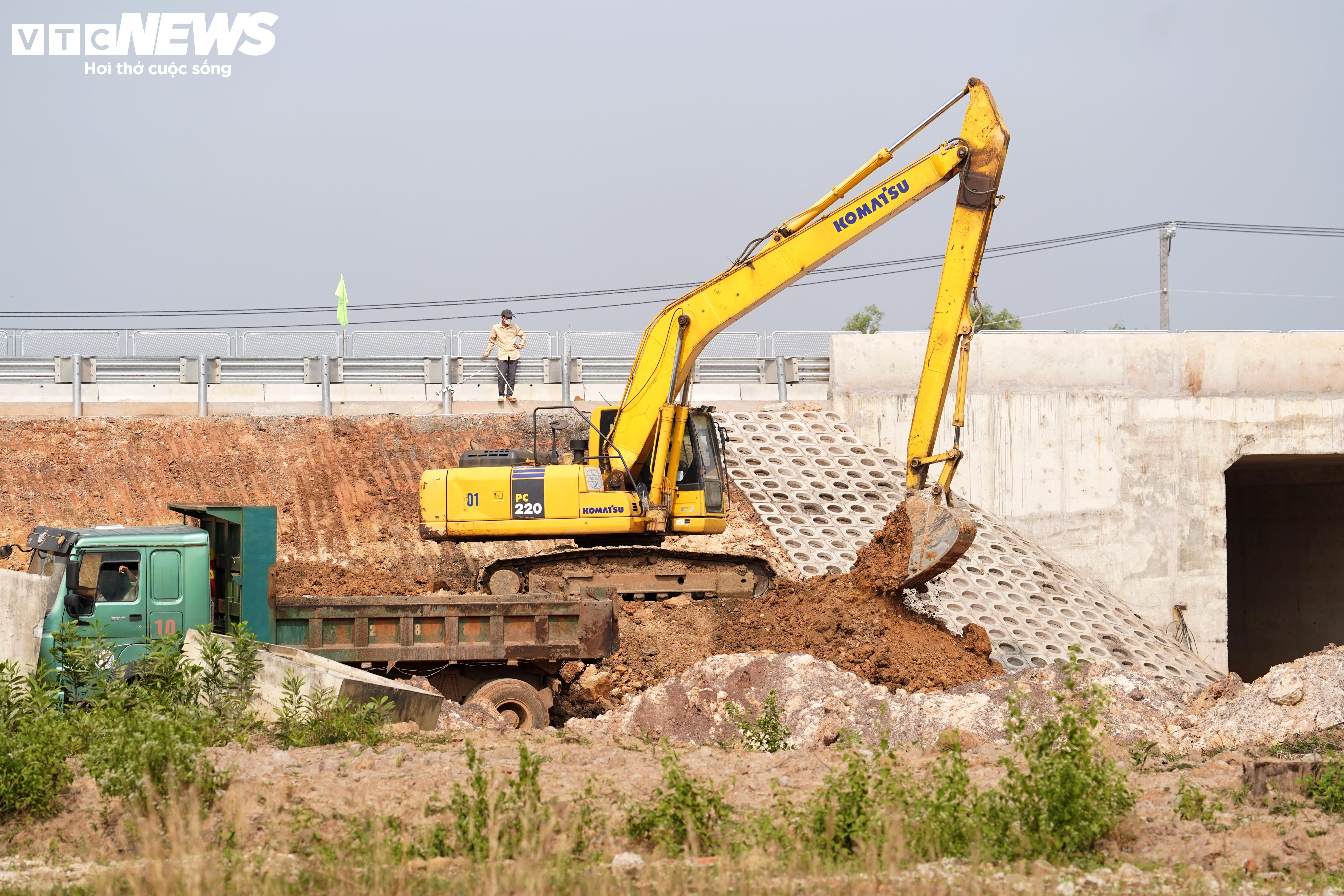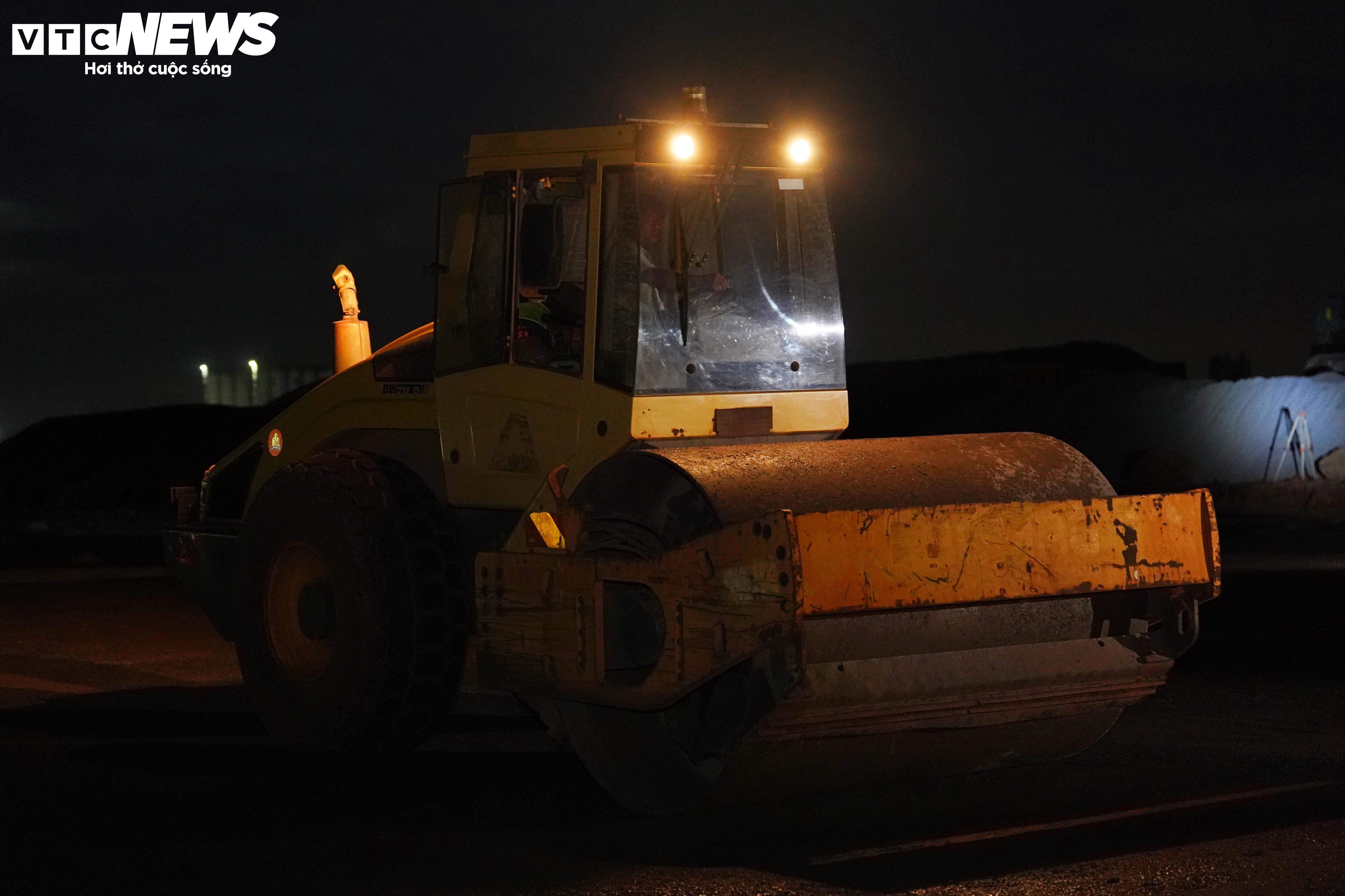 Máy móc hoạt động liên tục, công nhân tranh thủ từng giờ để đẩy nhanh tiến độ nền, mặt đường.
