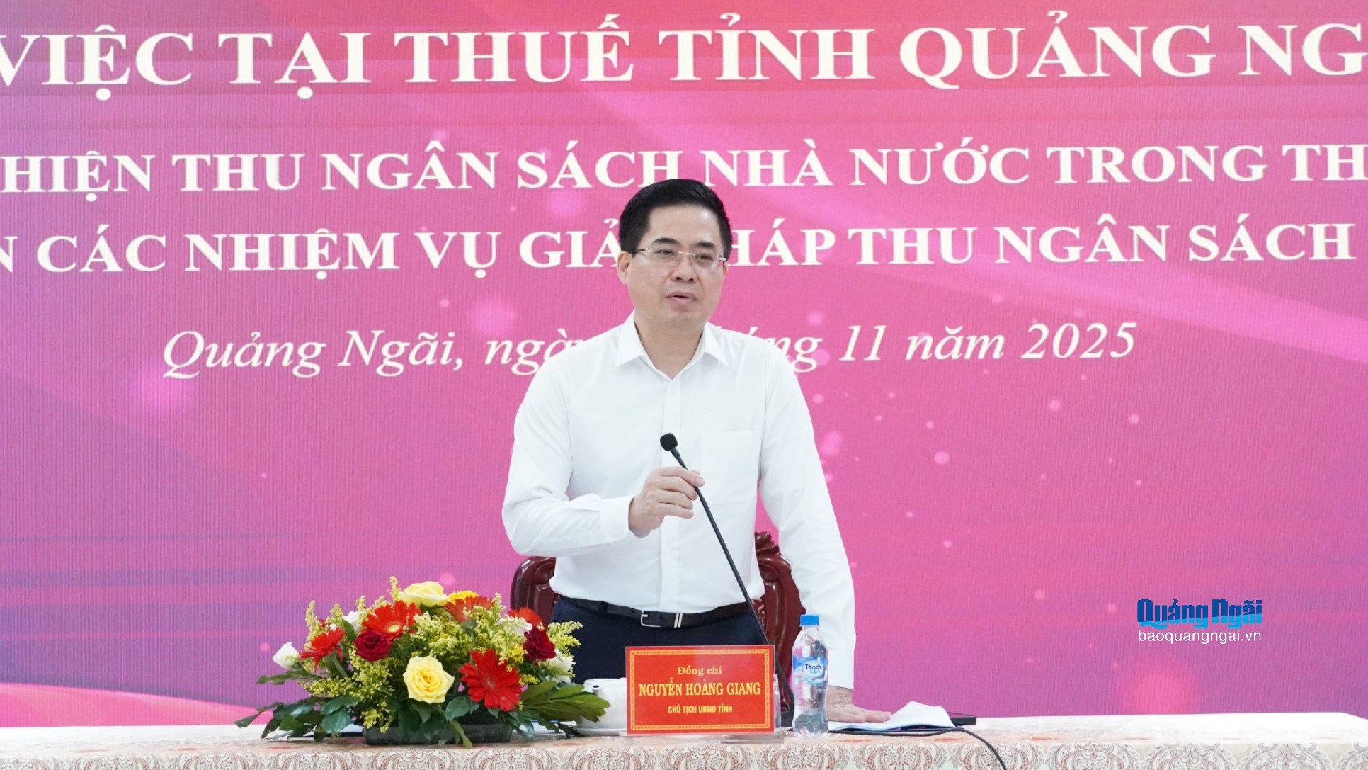 Sáng 19/11, Phó Bí thư Tỉnh ủy, Chủ tịch UBND tỉnh Nguyễn Hoàng Giang có buổi làm việc với Thuế tỉnh Quảng Ngãi về tình hình thực hiện thu ngân sách nhà nước trong thời gian qua và triển khai nhiệm vụ, giải pháp thu ngân sách từ nay đến hết năm 2025.