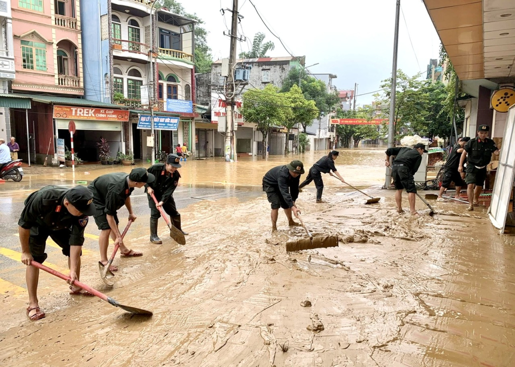 Lực lượng vũ trang giúp người dân dọn dẹp, vệ sinh đường phố sau khu nước lũ rút.