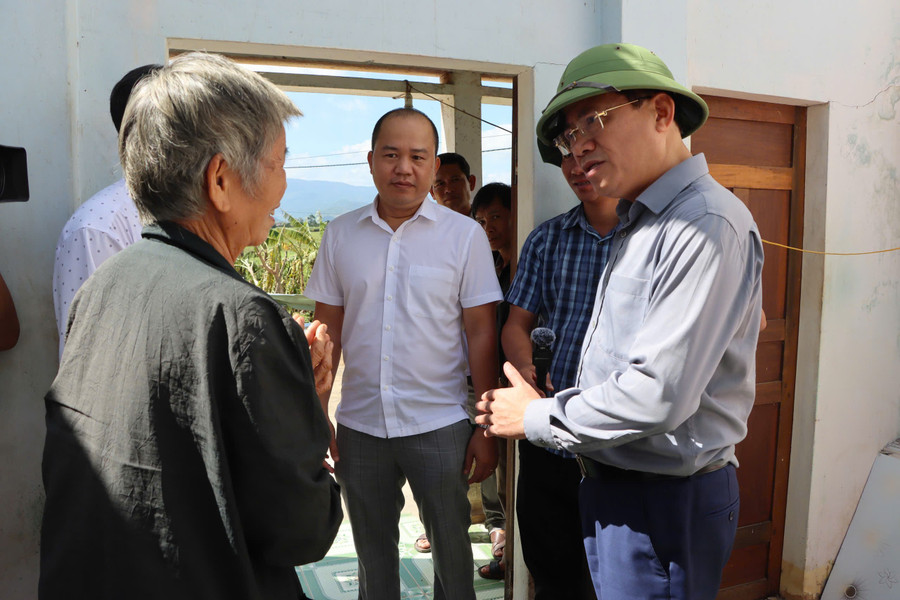 Chủ tịch UBND tỉnh Phạm Anh Tuấn (bìa phải) thăm hỏi, động viên gia đình bà Phạm Thị Dớt (xã Bình An) có nhà bị tốc mái hoàn toàn do bão số 13. Ảnh: Thùy Trang