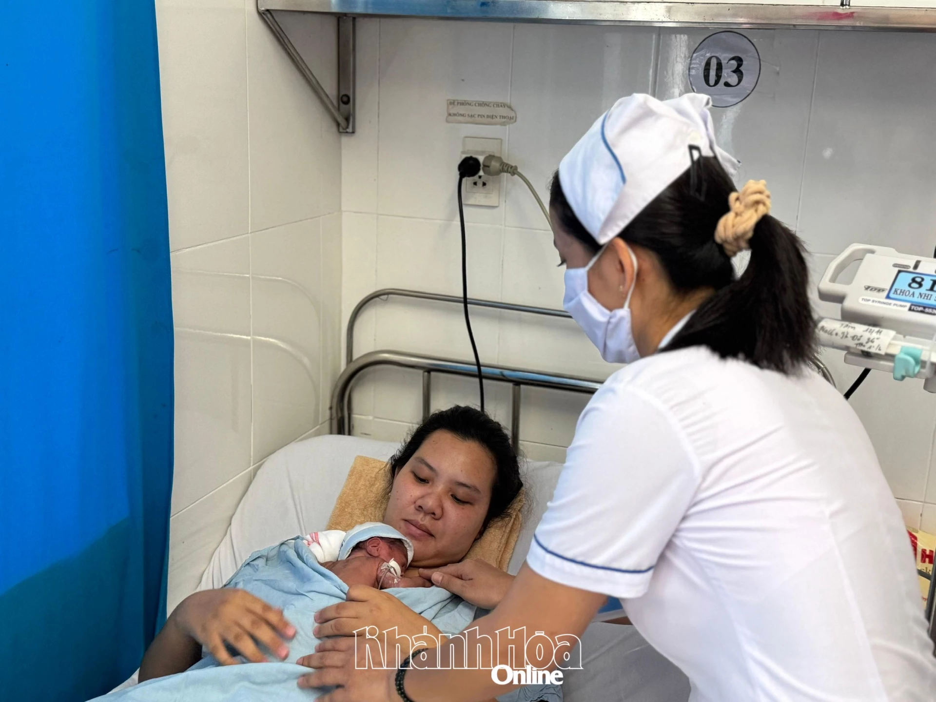 Cán bộ y tế Bệnh viện Đa khoa Ninh Thuận hướng dẫn sản phụ thực hiện phương pháp Kangaroo cho mẹ và bé.