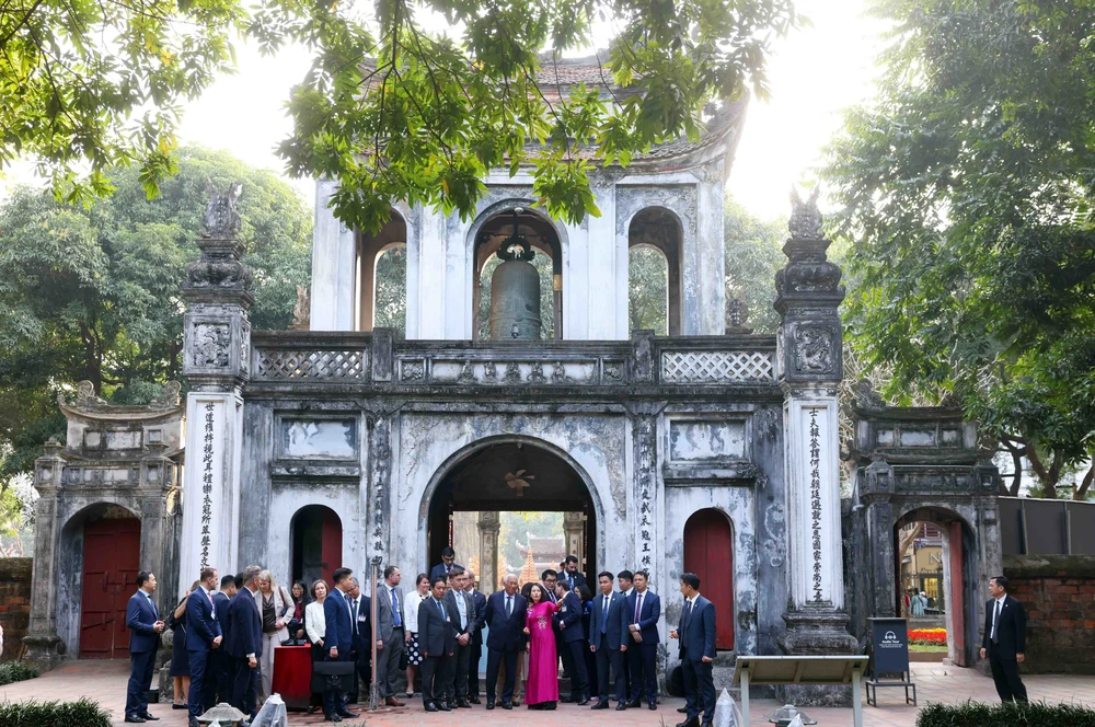 Chủ tịch Hội đồng châu Âu António Costa đến tham quan Khu di tích quốc gia đặc biệt Văn Miếu - Quốc Tử Giám. Ảnh: Phạm Kiên - TTXVN