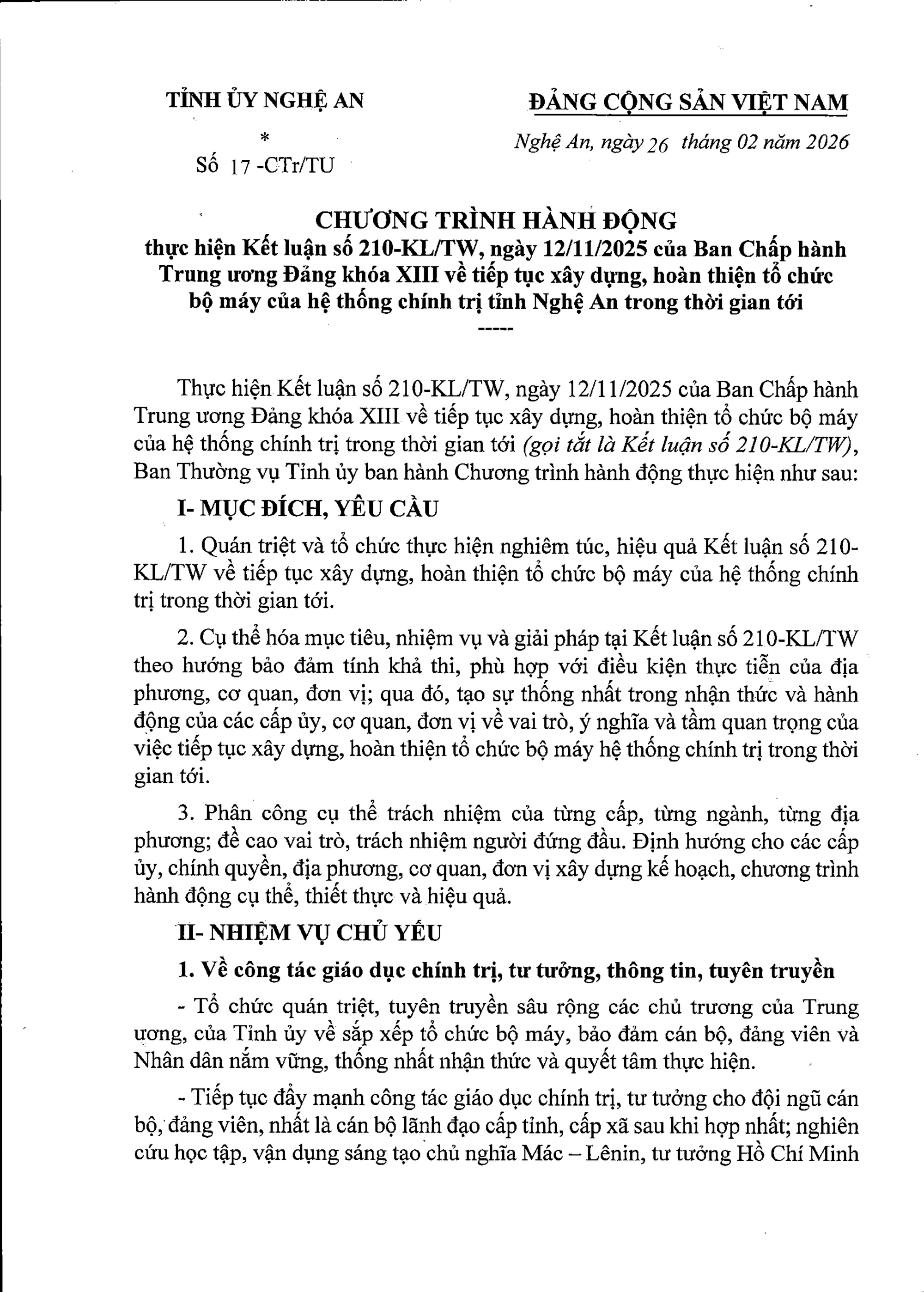 TOÀN VĂN: Chương trình hành động số 17-CTr/TU ngày 26/02/2026 thực hiện Kết luận số 210-KL/TW của Ban Chấp hành Trung ương Đảng khóa XIII Của Ban Thường vụ Tỉnh ủy Nghệ An.