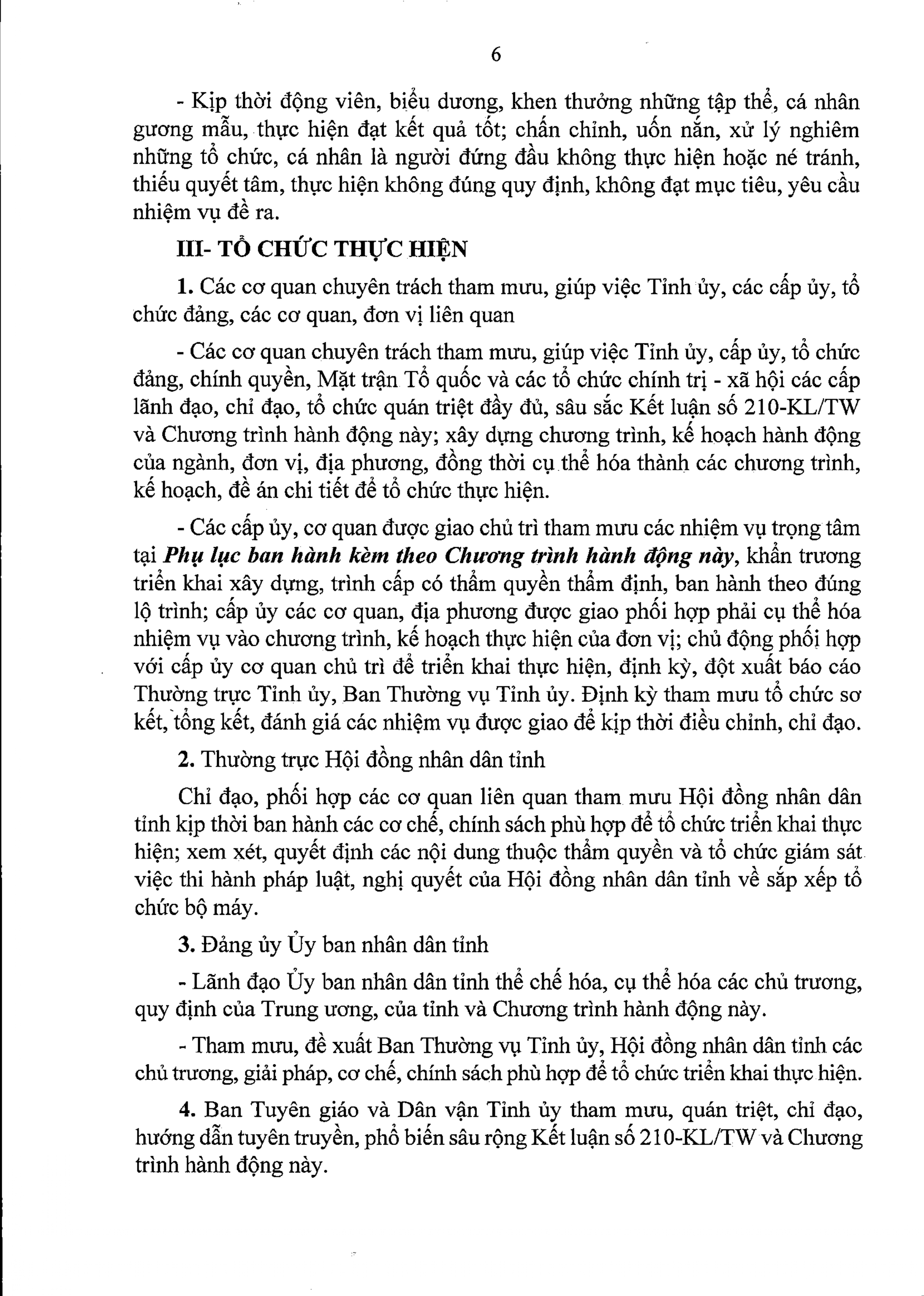 Để Chương trình hành động đi vào cuộc sống, Ban Thường vụ Tỉnh ủy giao nhiệm vụ cụ thể cho các cơ quan tham mưu Tỉnh ủy, các cấp ủy, tổ chức đảng tổ chức quán triệt sâu sắc Kết luận số 210-KL/TW; xây dựng kế hoạch hành động chi tiết của ngành, đơn vị mình. Chủ động phối hợp triển khai các nhiệm vụ trọng tâm và định kỳ báo cáo Thường trực Tỉnh ủy.