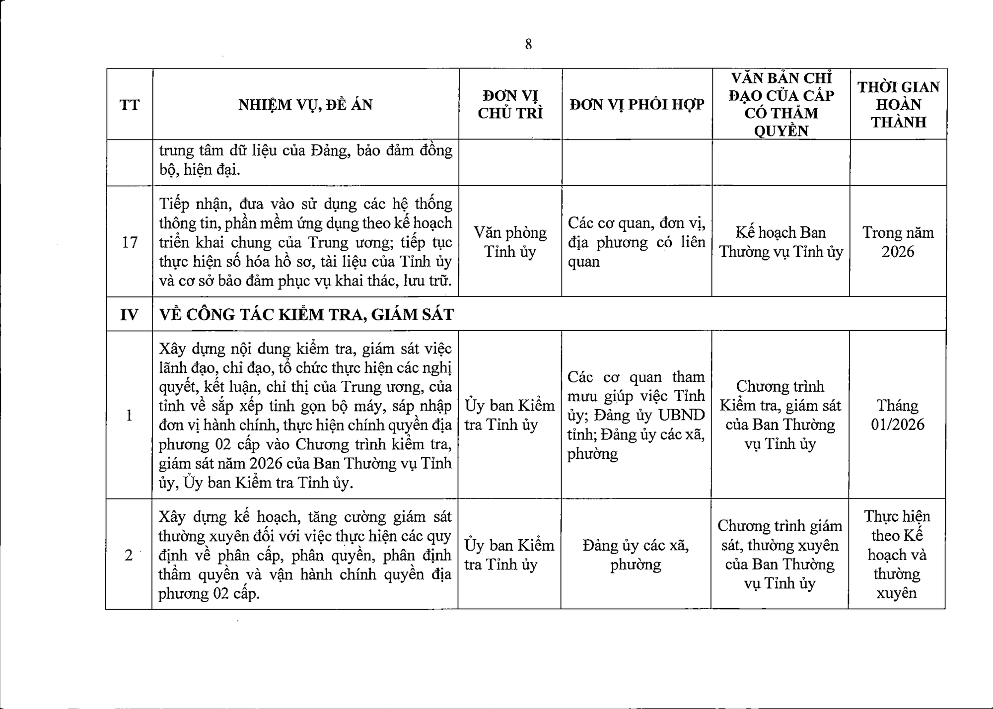 Ban Tổ chức Tỉnh ủy chủ trì phối hợp theo dõi, chỉ đạo, kiểm tra, đôn đốc quá trình thực hiện Chương trình hành động.