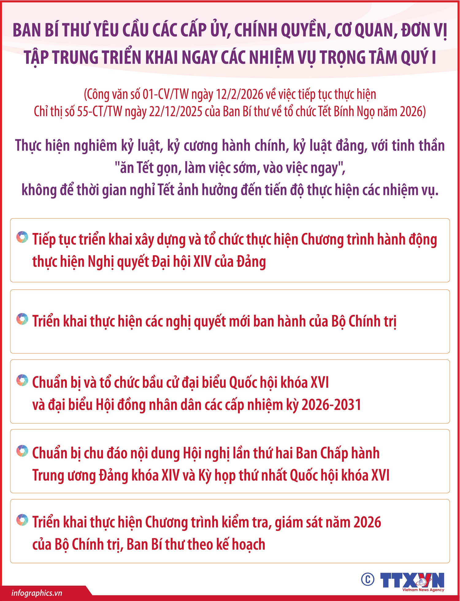 Ban Bí thư yêu cầu, các cấp ủy, chính quyền, cơ quan, đơn vị tập trung triển khai ngay các nhiệm vụ trọng tâm quý I: Tiếp tục triển khai xây dựng và tổ chức thực hiện Chương trình hành động thực hiện Nghị quyết Đại hội XIV của Đảng; triển khai thực hiện các nghị quyết mới ban hành của Bộ Chính trị; chuẩn bị và tổ chức bầu cử đại biểu Quốc hội khóa XVI và đại biểu Hội đồng nhân dân các cấp nhiệm kỳ 2026-2031; chuẩn bị chu đáo nội dung Hội nghị lần thứ hai Ban Chấp hành Trung ương Đảng khóa XIV và Kỳ họp thứ nhất Quốc hội khóa XVI; triển khai thực hiện Chương trình kiểm tra, giám sát năm 2026 của Bộ Chính trị, Ban Bí thư theo kế hoạch.