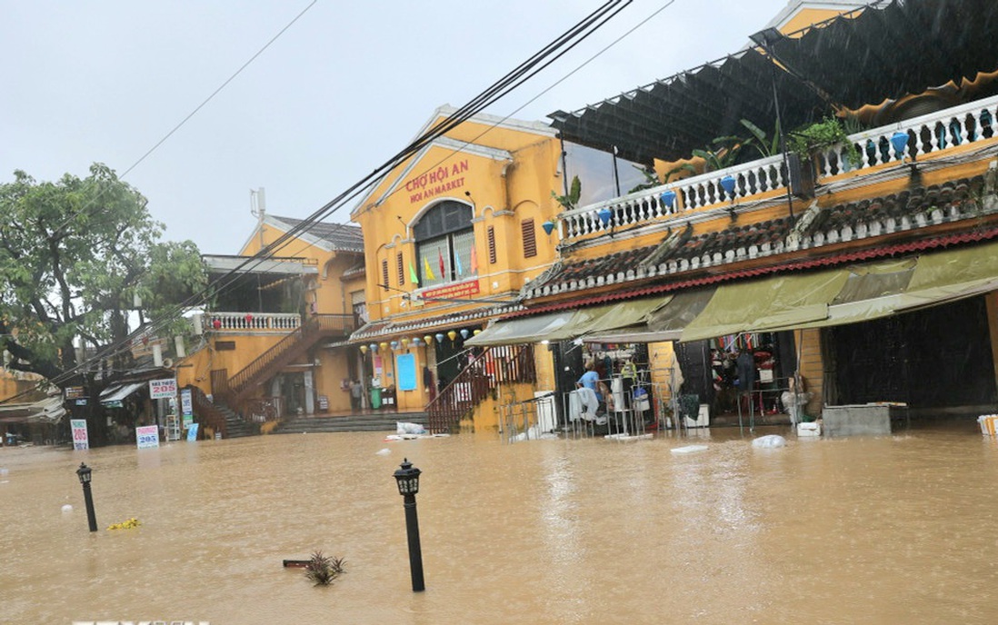 Nước ngập sâu tại nhiều tuyến phố thuộc khu vực chợ Hội An. (Ảnh: Anh Dũng/TTXVN)