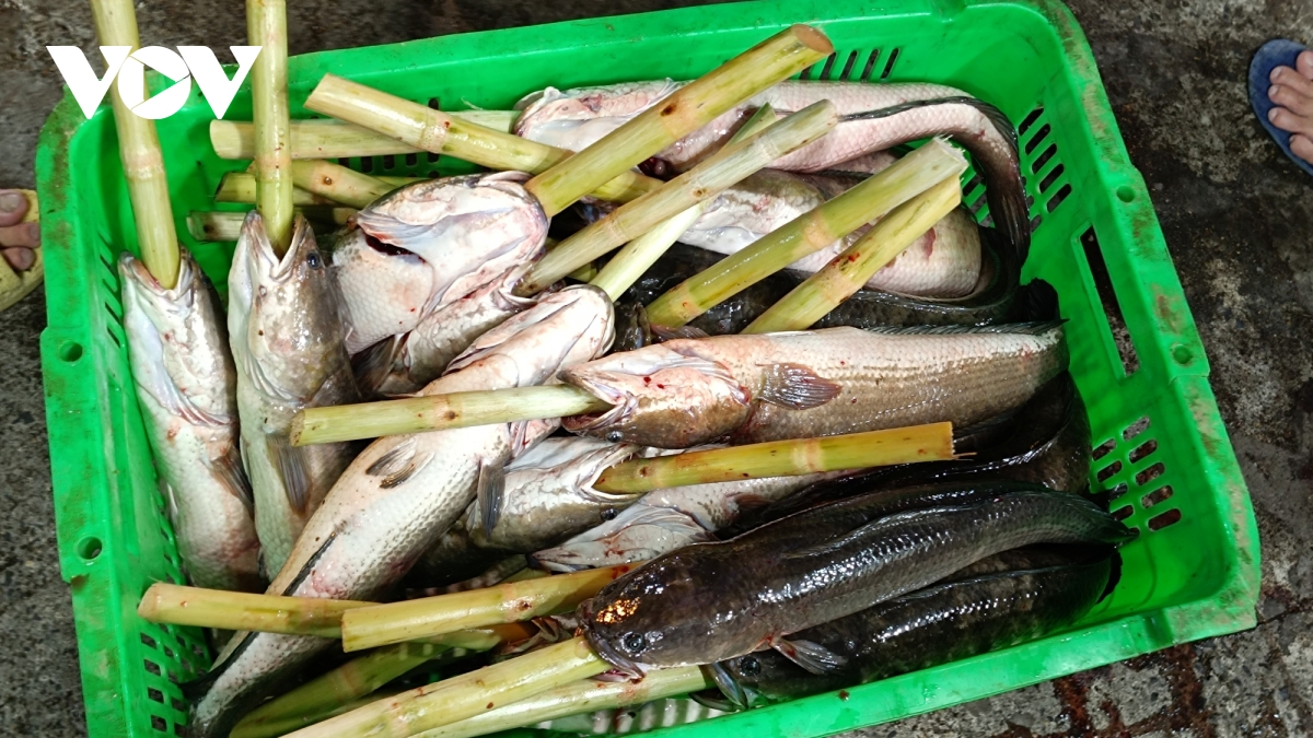 Những con cá nặng từ 1-3kg được làm sạch và xiên bằng thân cây mía