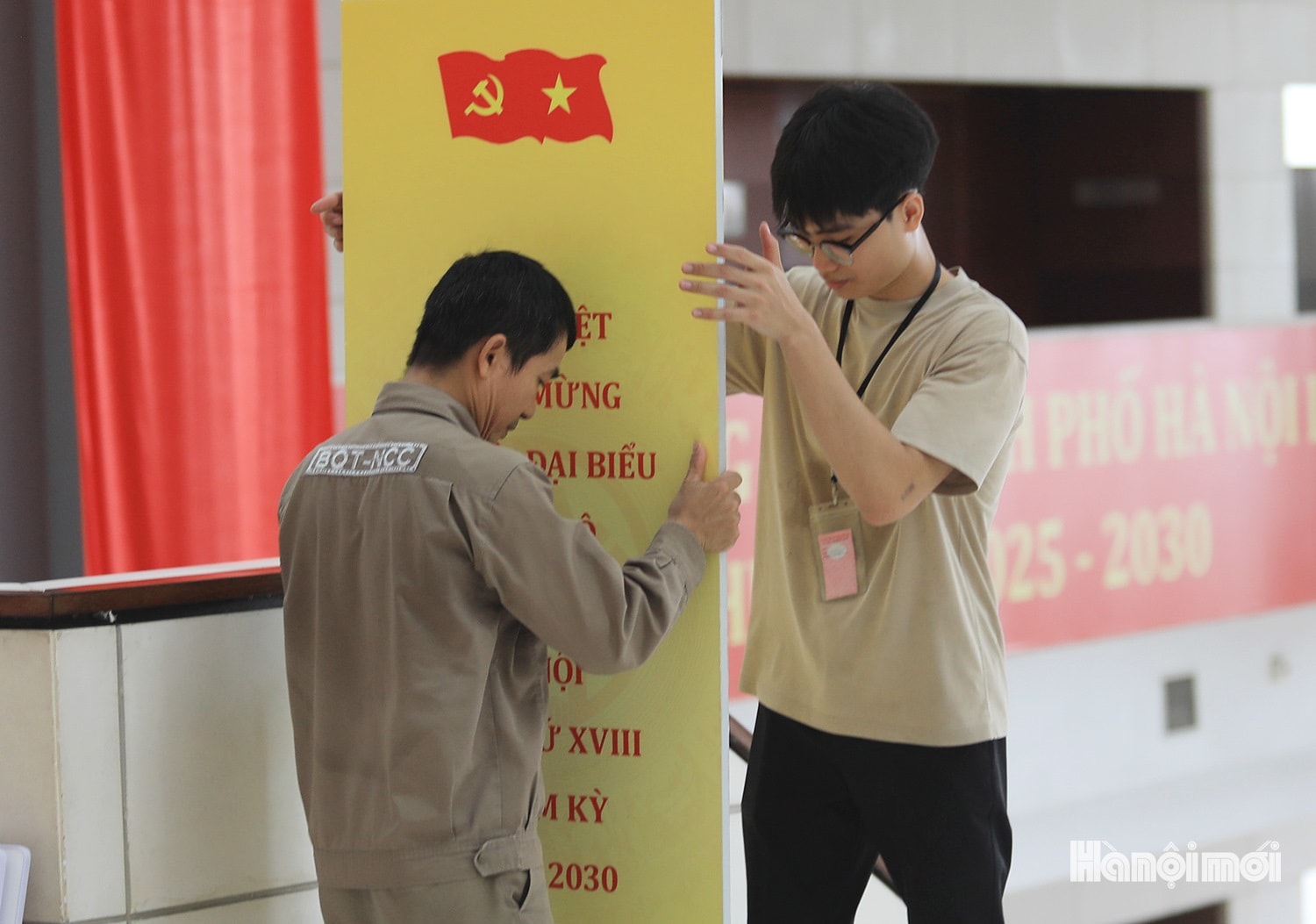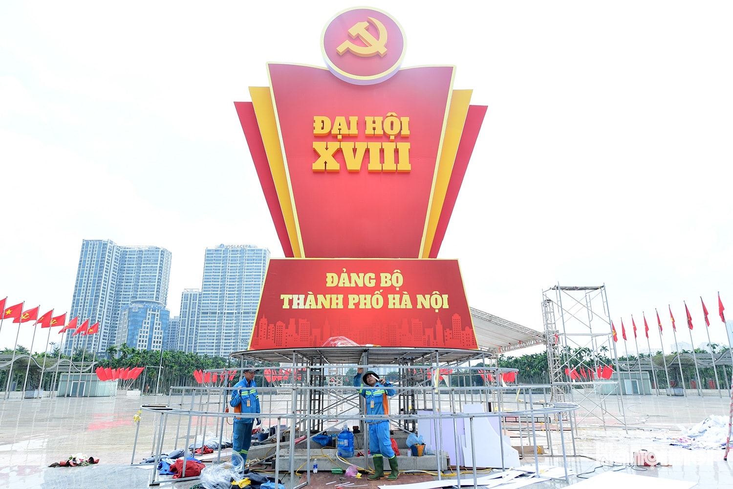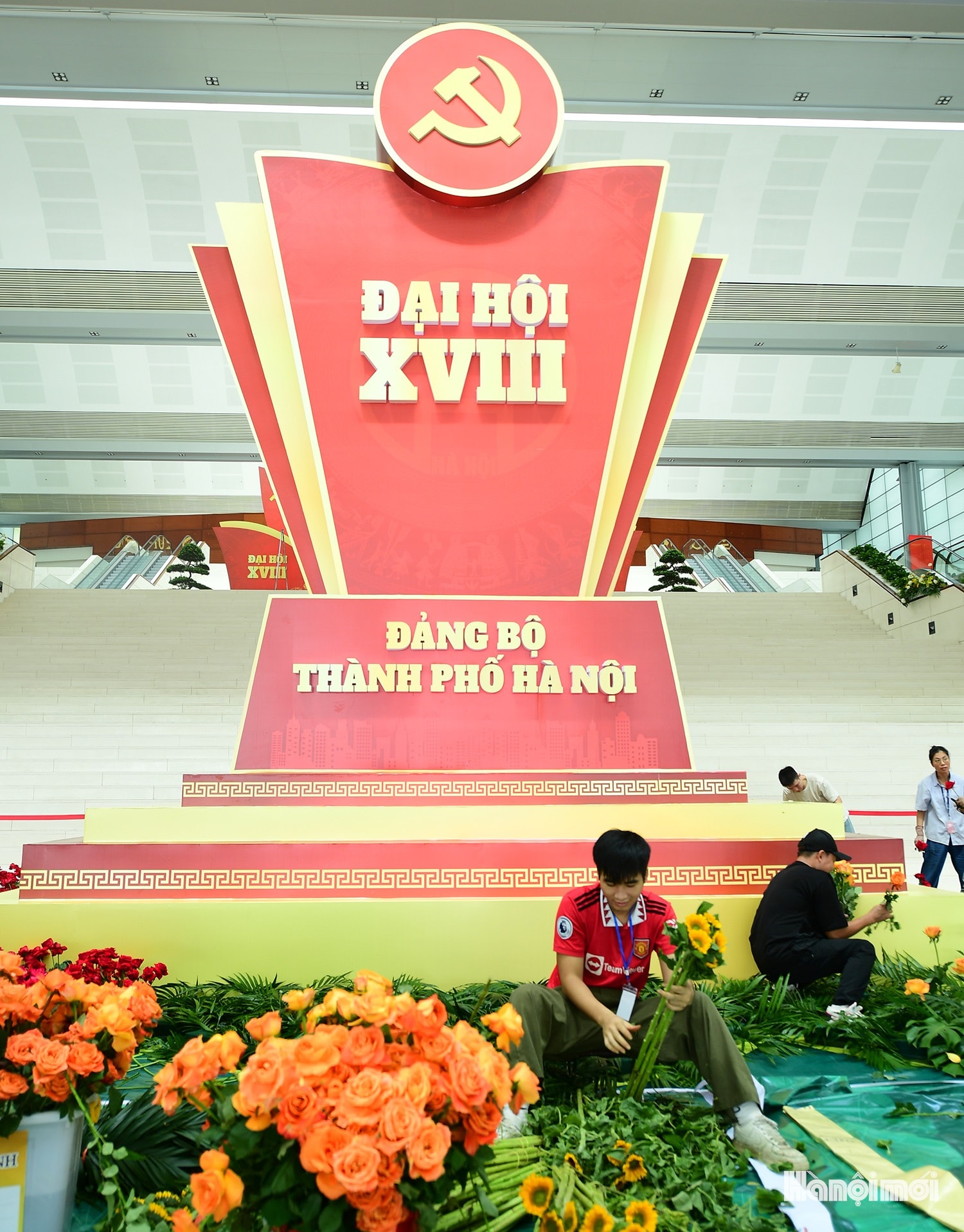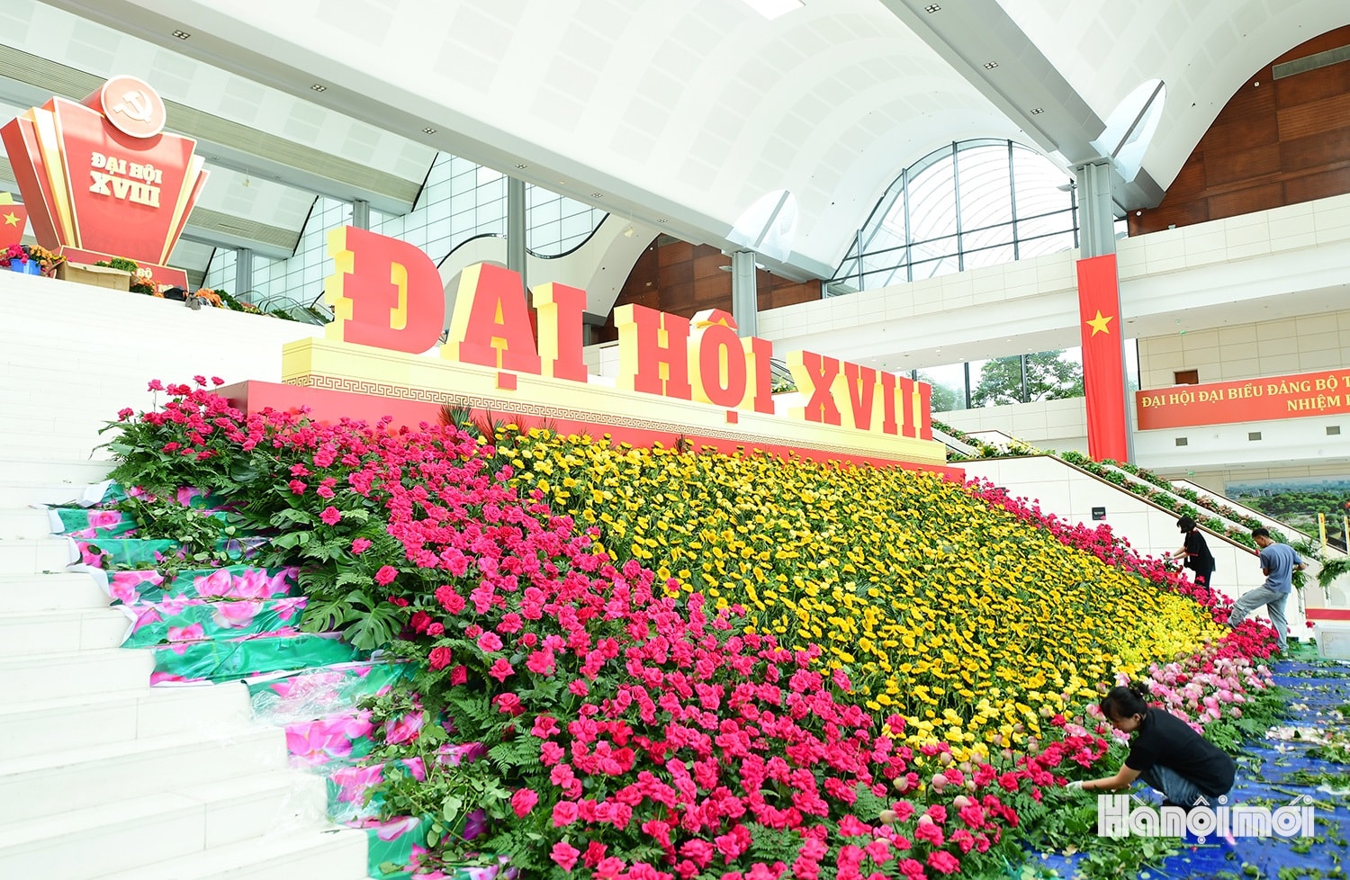 Hơn 12h, các cụm trang trí phục vụ Đại hội cơ bản đã hoàn thành.