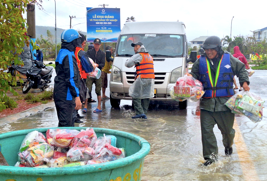 Công an phường Quy Nhơn cũng phối hợp các nhà hảo tâm tổ chức cấp phát lương thực, nước uống, mì tôm, và các nhu yếu phẩm thiết yếu cho các hộ bị ảnh hưởng nặng trên địa bàn phường, chuyển gần 200 suất cơm và nhu yếu phẩm cho công an các phường Quy Nhơn Đông, Quy Nhơn Tây, Quy Nhơn Bắc kịp thời hỗ trợ cho người dân vùng ngập sâu.