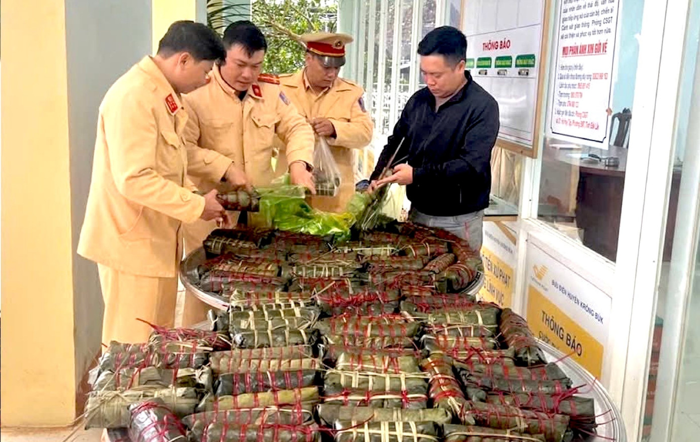 Phòng Cảnh sát giao thông (Công an tỉnh Đắk Lắk) cũng tập kết bánh chưng, nhu yếu phẩm để tiếp tế cho bà con vùng lũ.