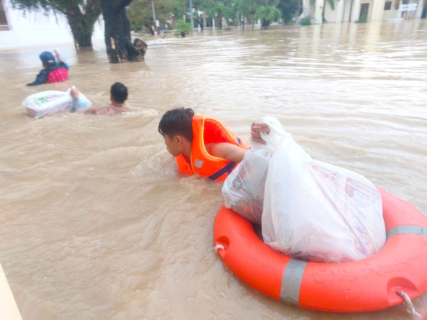 Trường Cao đẳng Kỹ thuật Công nghệ Quy Nhơn bị ngập sâu, nhiều đoạn nước dâng cao hơn đầu người. Trong hoàn cảnh ấy, các thầy cô không ngại mưa gió, lội nước hàng cây số, mang lương thực, mì gói, nước uống, đồ ăn… vào tận ký túc xá để tiếp tế cho các em.