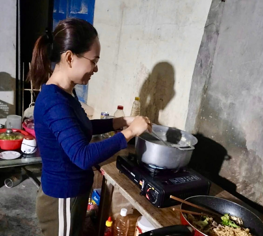 Chị Nguyễn Đỗ Thảo Anh, xã Diên Điền nấu cơm bằng bếp gas mini sau trận lũ lịch sử. (Ảnh : Thanh Huy)