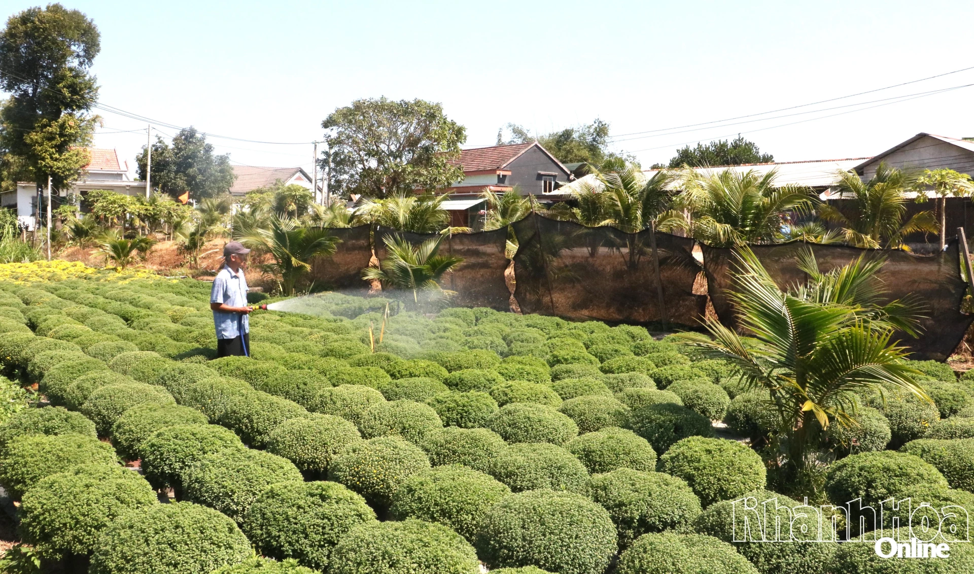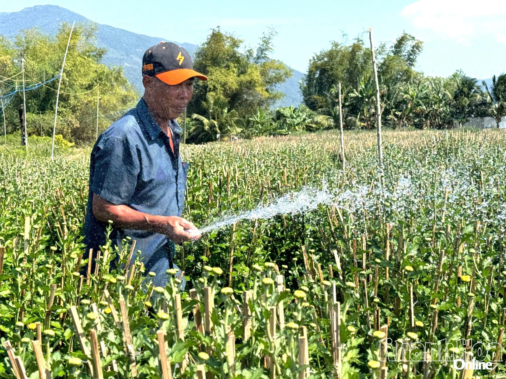 Vừa kéo ống nước tưới cho dãy cúc mâm xôi, ông Lê Quang Vinh (thôn Đại Tập, xã Hòa Trí) vừa tranh thủ buộc những nhánh mới bung tán. Ông Vinh cho biết, thời điểm này không dám nghỉ ngơi, chỉ cần lơ là vài ngày là hoa lệch dáng, nở không đều, coi như mất Tết. Đây là năm đầu tiên ông chuyển từ trồng dưa hấu sang cúc mâm xôi, nhưng do đã tìm hiểu kỹ về cách trồng nên ông rất tự tin. Thời điểm xuống giống được ông tính toán kỹ, là vào cuối tháng 5 âm lịch để cây có đủ thời gian sinh trưởng, ra nụ và nở hoa đúng dịp Tết Nguyên đán. “Cúc mâm xôi nhân giống bằng giâm cành nên cây không đồng đều, phải chỉnh tán liên tục, canh nắng, canh nước, canh cả thời điểm bấm nụ. Làm hoa cực ở chỗ đó”, ông Vinh chia sẻ.