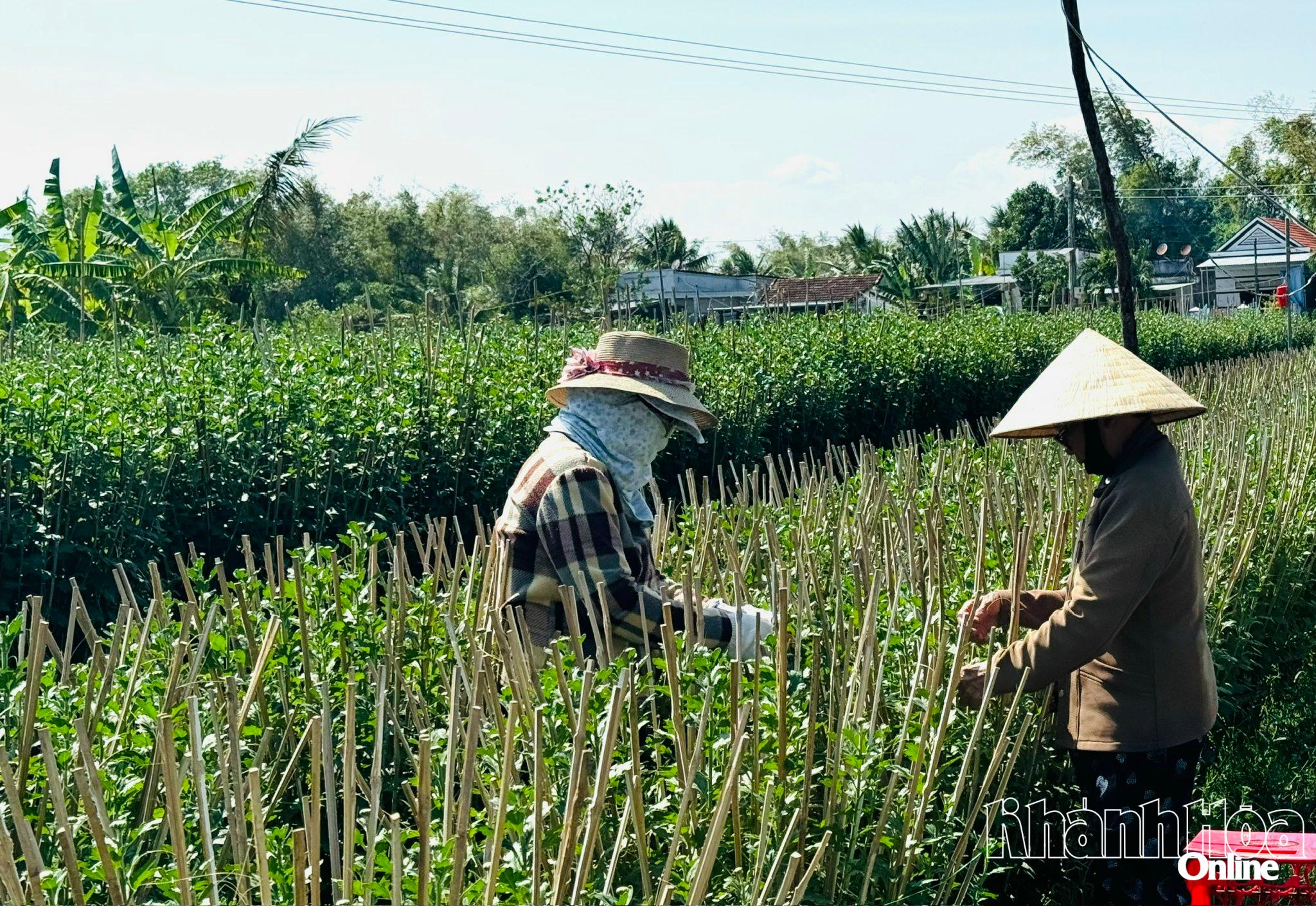 Đến cánh đồng hoa cúc xã Hòa Trí những ngày này chúng tôi ghi nhận không khí rộn ràng tiếng gọi nhau, tiếng cắt tỉa cành, tiếng nước tưới tí tách trên các luống hoa. Đây là thời điểm người trồng hoa bước vào giai đoạn “nước rút”, quyết định chất lượng vụ hoa Tết nên các nhà vườn tất bật hơn bao giờ hết.