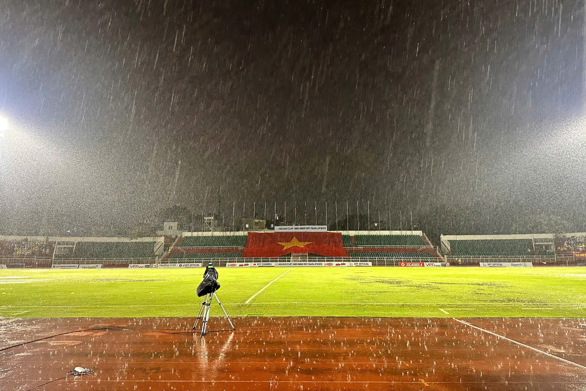 Đội tuyển Việt Nam thi đấu trên mặt sân như vũng bùn sau khi trời mưa to và kéo dài trước trận.