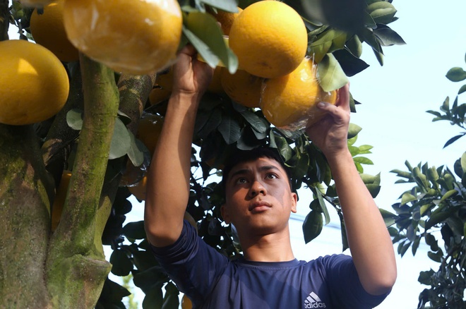 Quân cho biết, mình được thuê bọc băng dán cho quả bưởi nhằm tránh trầy xước khi vận chuyển. "Công việc khá nhẹ, làm đến khoảng 26 Tết là có một khoản chi tiêu, phụ giúp gia đình sắm sửa những ngày đầu năm", Quân nói.