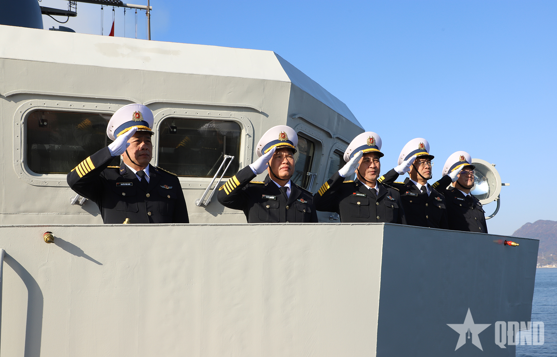 Đoàn công tác và cán bộ, thủy thủ Tàu 015 chào cảng.