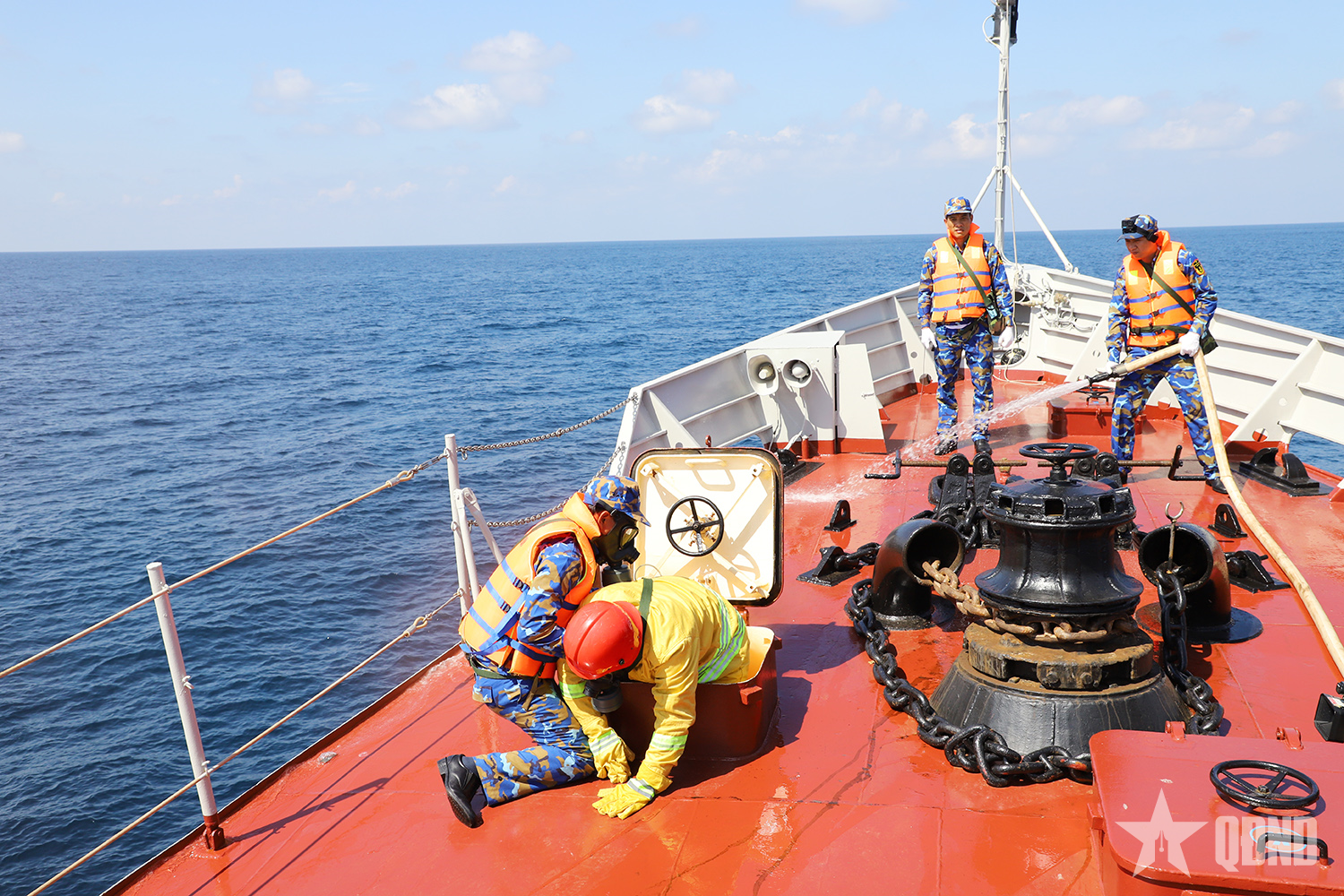 Cán bộ, chiến sĩ Tàu 17 luyện tập bảng bố trí chiến đấu đấu tranh bảo vệ sức sống tàu.