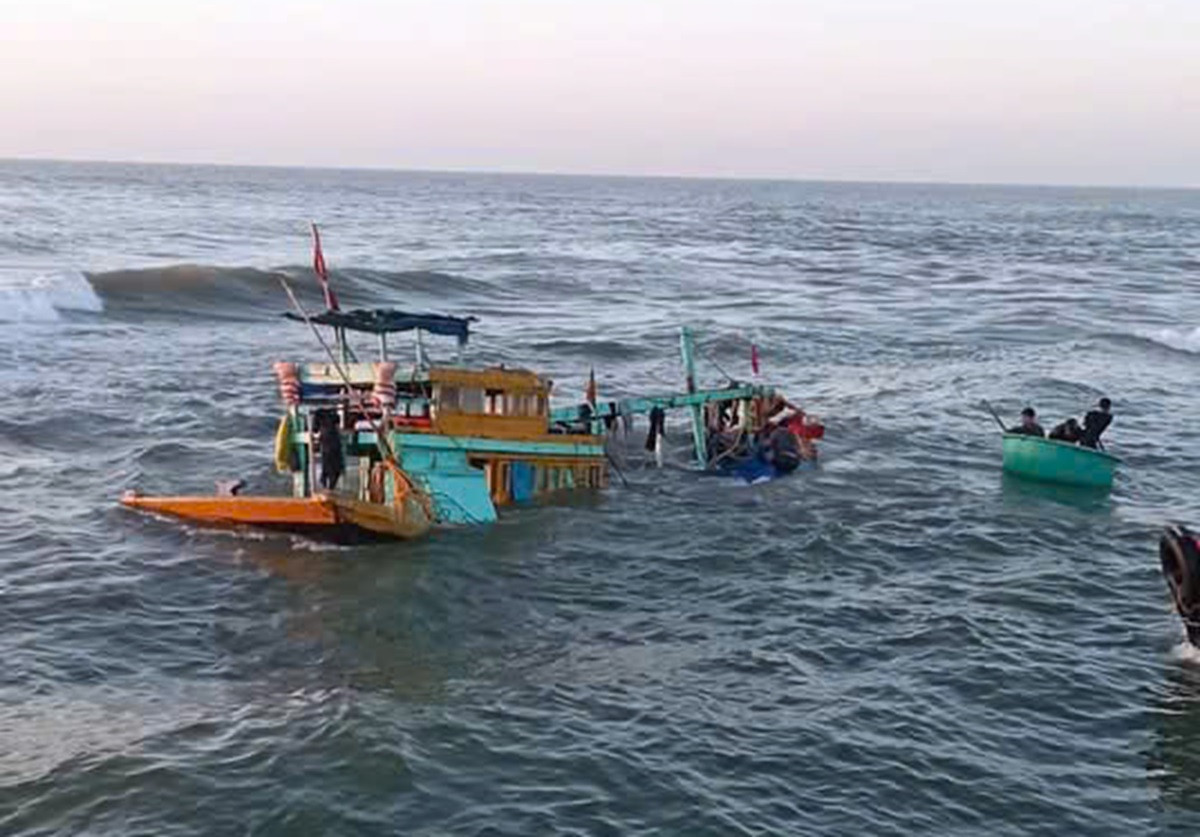 Tàu cá chở 15 thuyền viên bị sóng đánh chìm tại khu vực cửa biển La Gi. Ảnh: Q.H