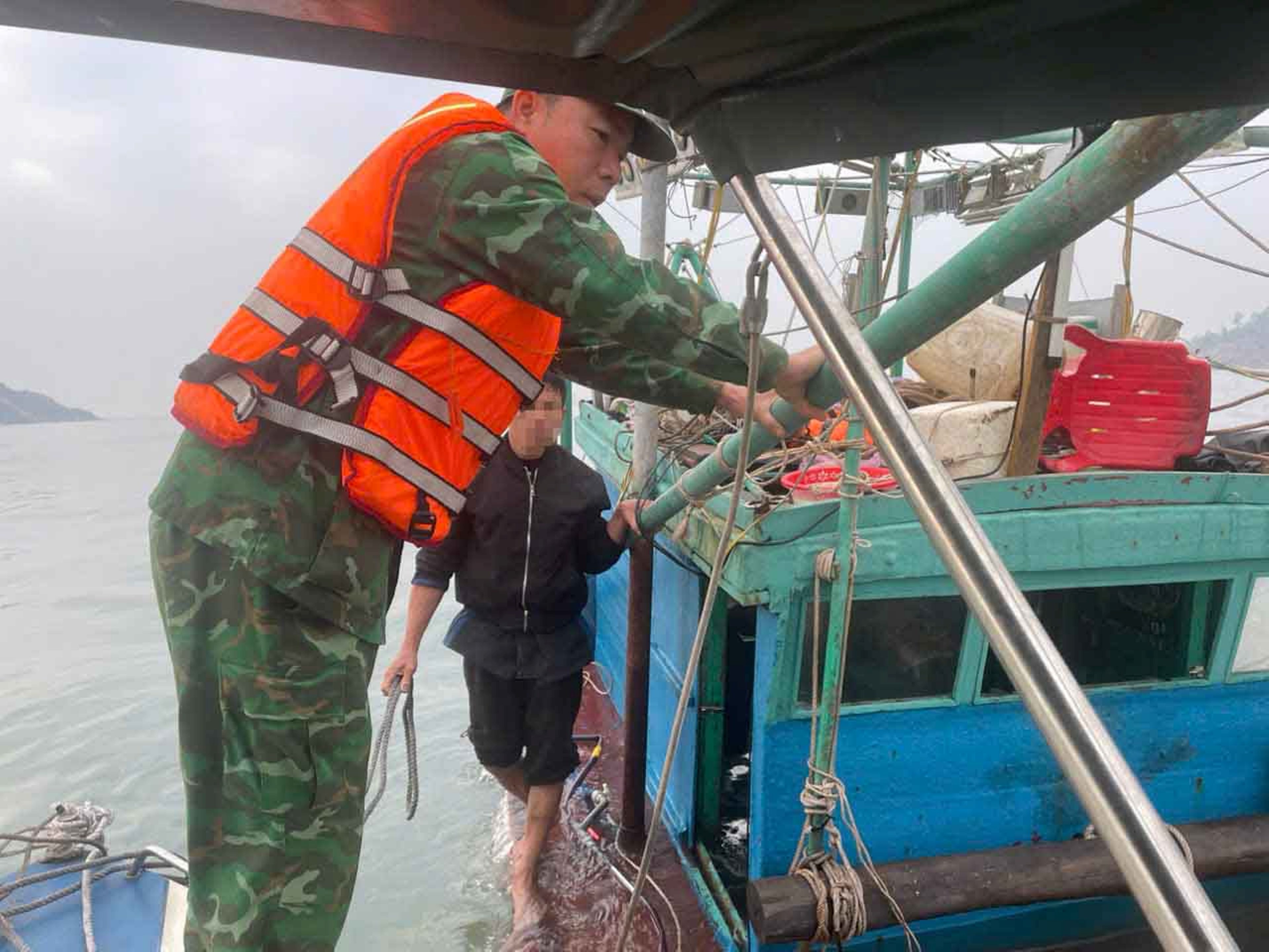 Lực lượng Đồn Biên phòng Quỳnh Thuận ra hiện trường hỗ trợ ngư dân gặp nạn