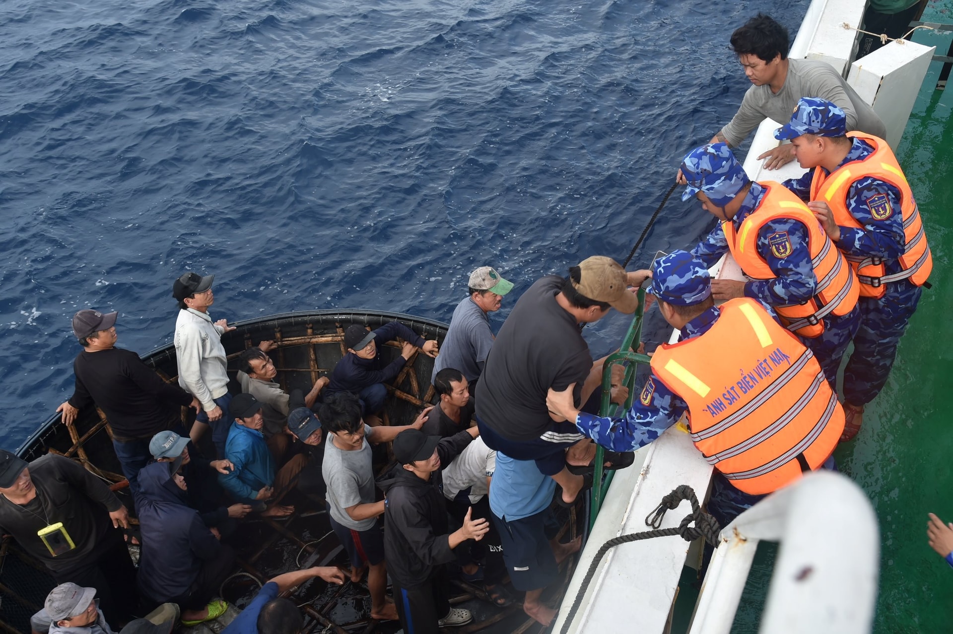 Tàu Cảnh sát biển 364 tổ chức tiếp nhận 52 thuyền viên từ các tàu cá cứu nạn, bảo đảm an toàn tuyệt đối cho ngư dân gặp nạn trên biển.