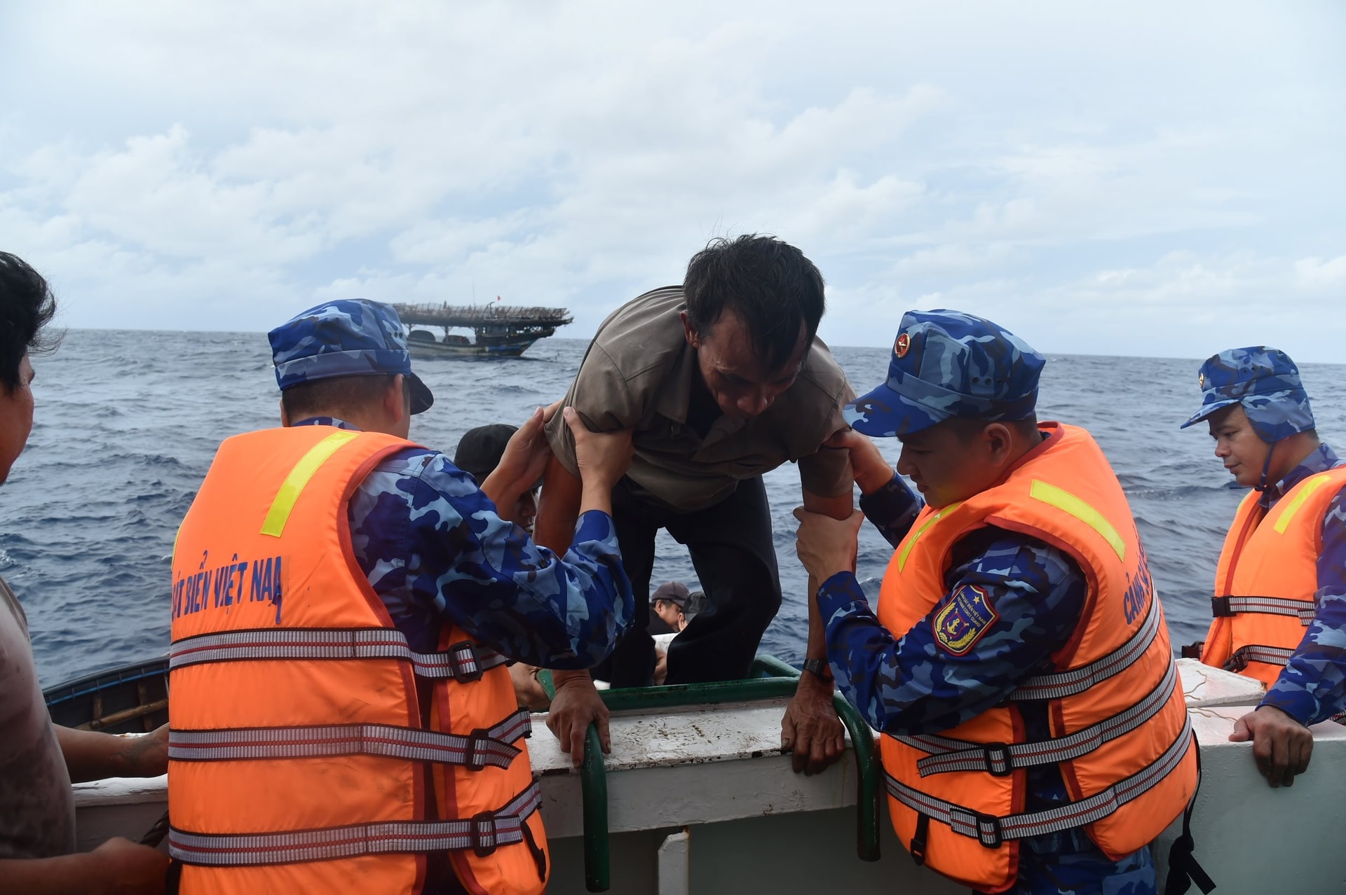 Cán bộ, chiến sĩ Bộ Tư lệnh Vùng Cảnh sát biển 2 hỗ trợ đưa thuyền viên tàu cá bị nạn từ tàu cá sang Tàu Cảnh sát biển 364 an toàn trên biển Trường Sa.