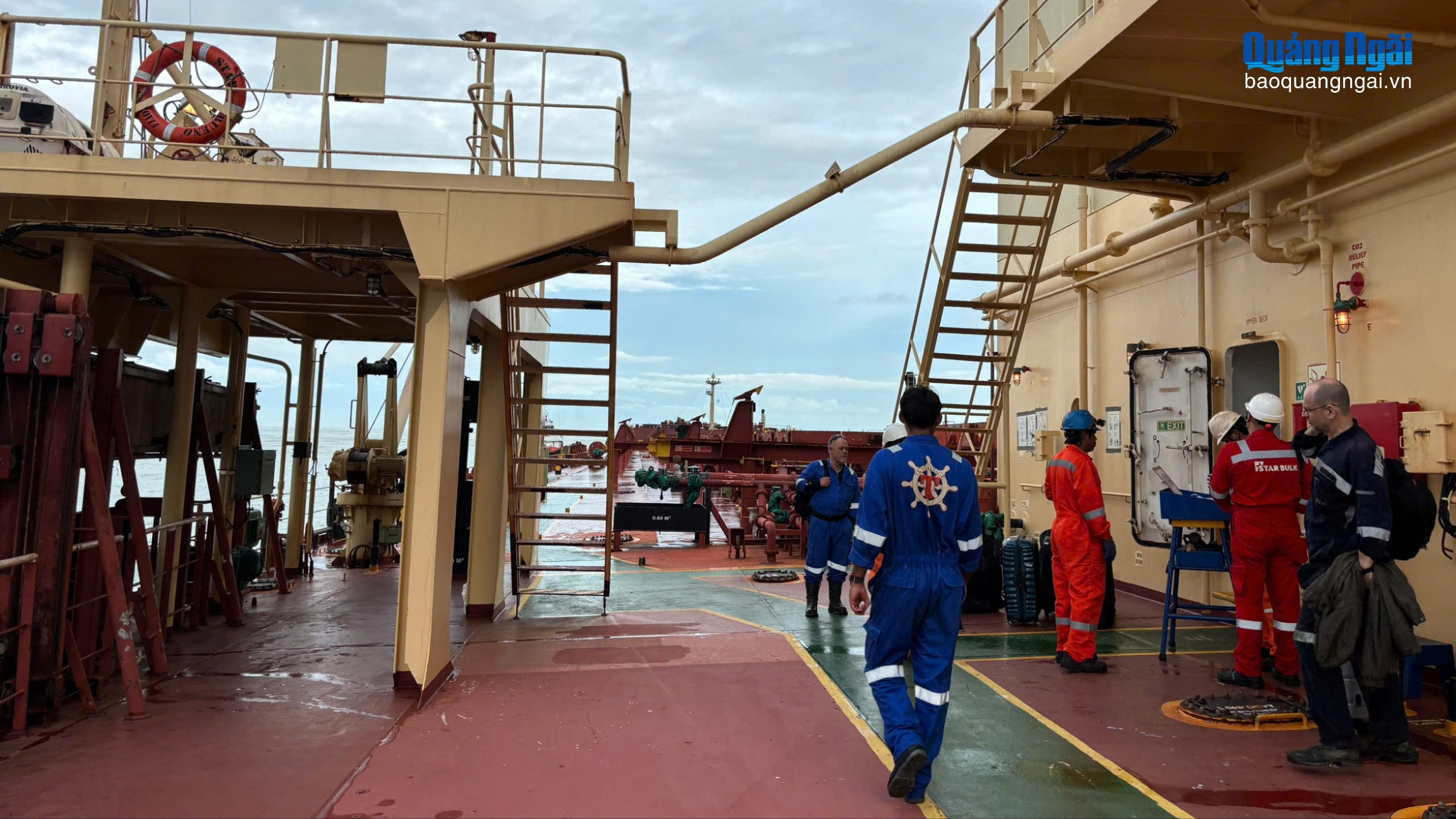 Trước tình hình đó, Đồn Biên phòng Cửa khẩu cảng Dung Quất đã phối hợp với các cơ quan chức năng cấp phép cho 3 phương tiện chuyên dụng cơ động đến hiện trường hỗ trợ bơm nước, kiểm soát an toàn tàu và thủy thủ đoàn. Các lực lượng tiếp tục theo dõi sát thời tiết, chủ động phương án ứng cứu, kịp thời xử lý nếu có tình huống phát sinh.