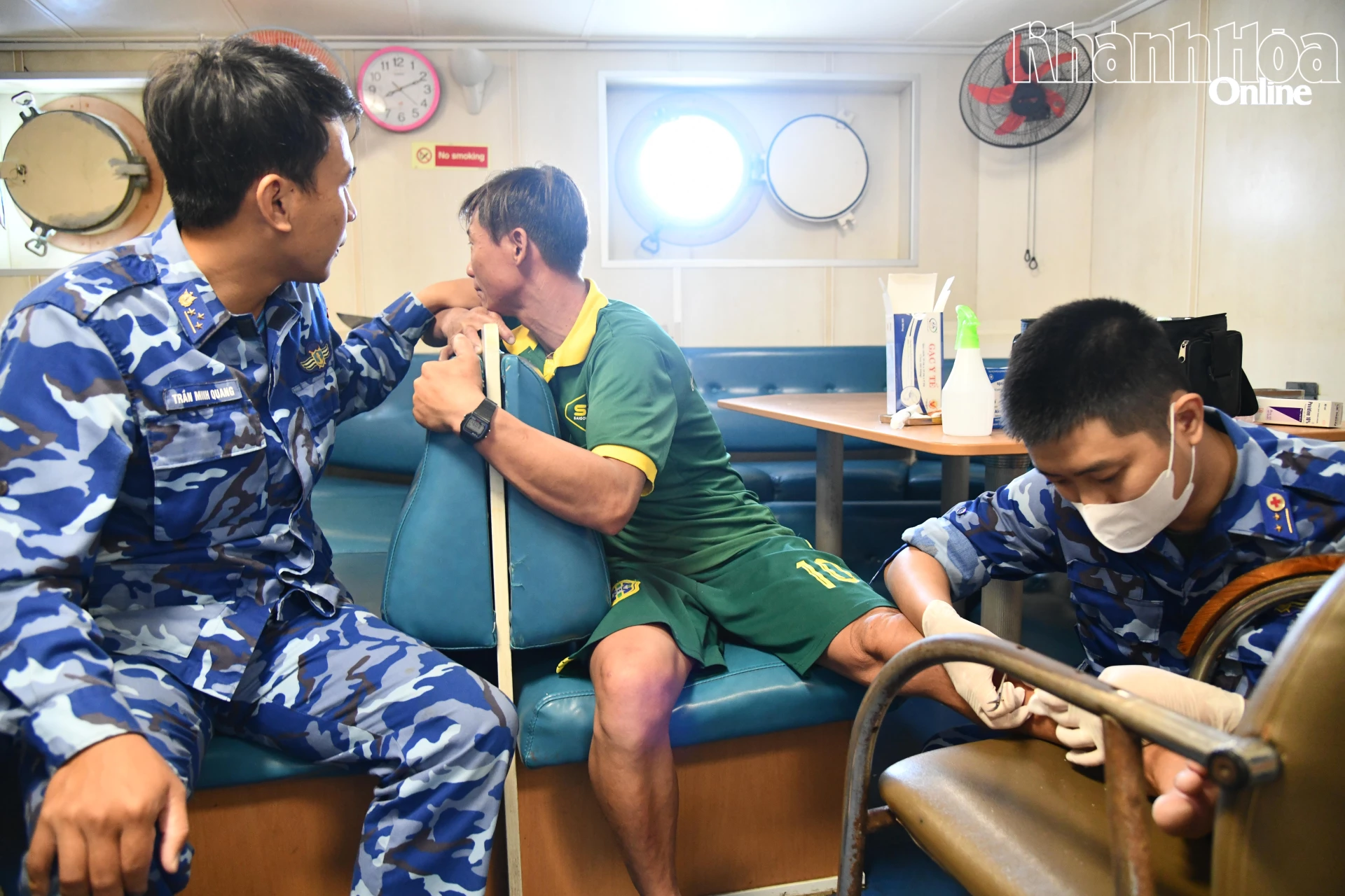 Qua thăm khám sơ bộ, nhân viên quân y của tàu xác định ông Quyền bị áp xe nghiêm trọng vùng cẳng chân trái. Vết thương đã bắt đầu viêm nhiễm nặng, gây đau nhức dữ dội, khiến ông Quyền không thể đi lại và thực hiện các hoạt động lao động trên biển.