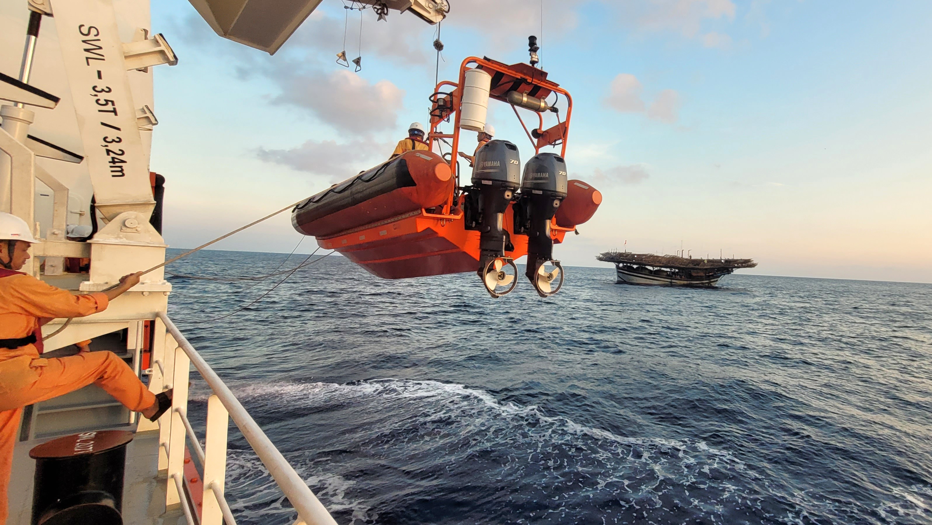 Lực lượng cứu nạn đưa ngư dân gặp nạn lên tàu SAR 631. Ảnh: MRCC