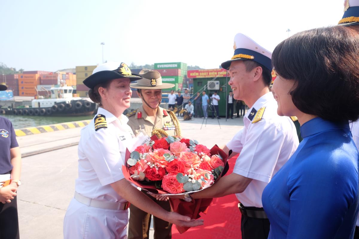 Trao tặng hoa cho Trung tá Alicia Harrison, Hải quân Hoàng gia Australia, là thuyền trưởng tàu Toowoomba.
