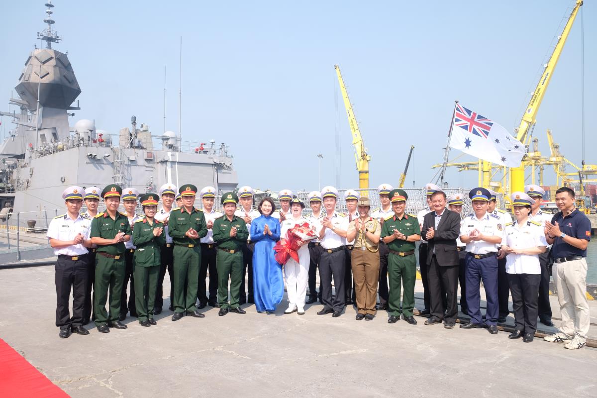 Các đại biểu chụp ảnh lưu niệm trước tàu Hải quân Hoàng gia Australia HMAS Toowoomba