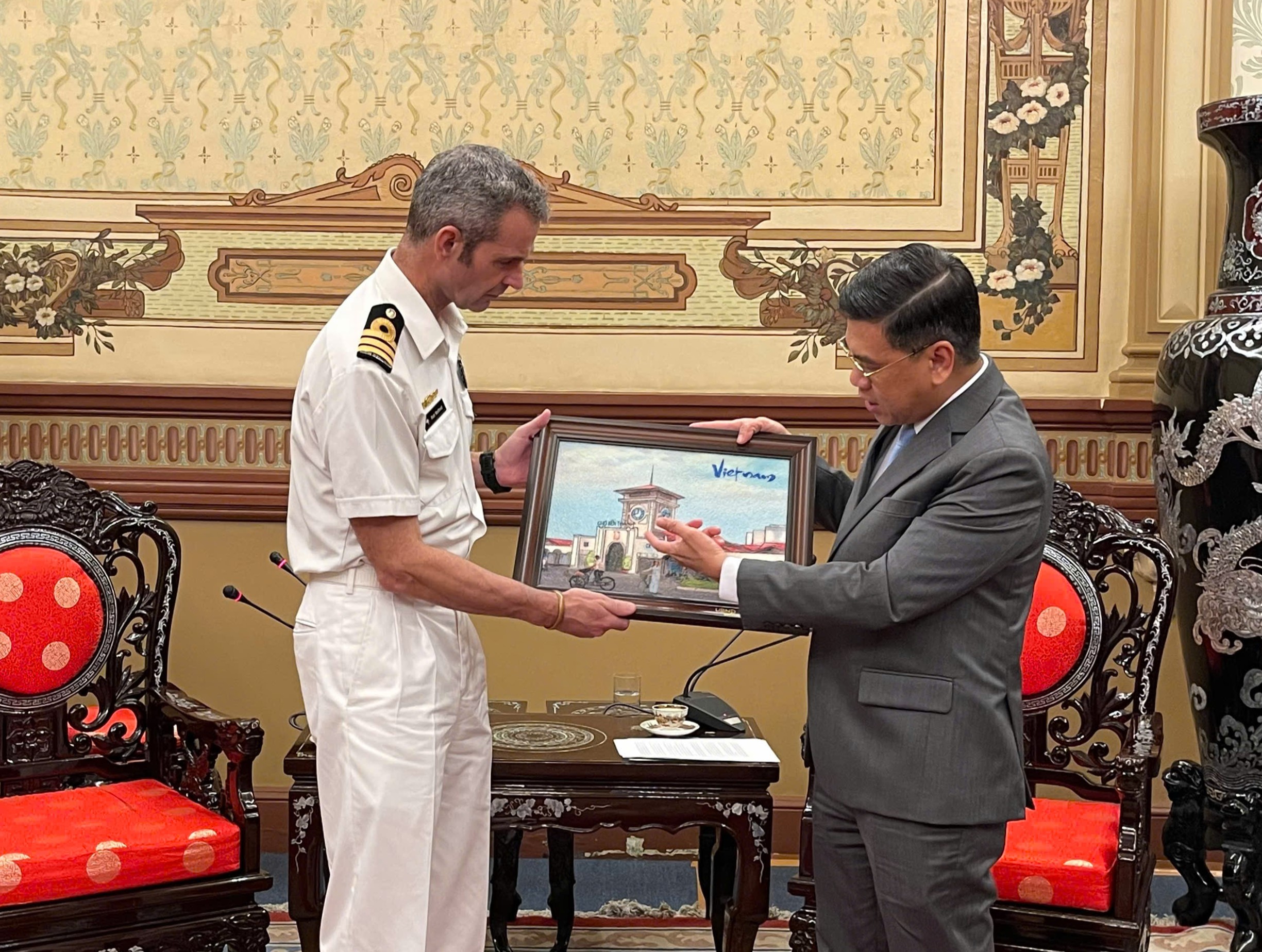 Phó Chủ tịch UBND TPHCM Nguyễn Văn Dũng trao quà lưu niệm đến Trung tá Robert Welford, chỉ huy Tàu HMNZS Aotearoa. Ảnh: PHƯƠNG NAM