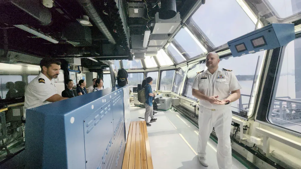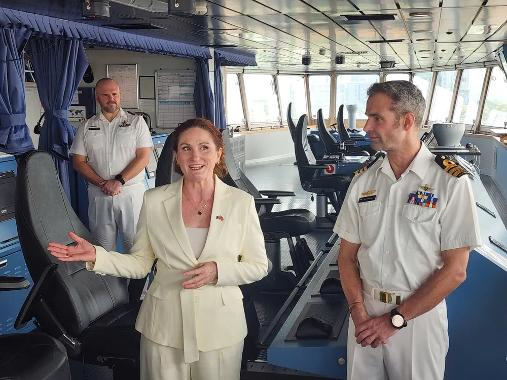 Bà Caroline Beresford, Đại sứ New Zealand tại Việt Nam (trái) và Trung tá Rob Welford, Chỉ huy tàu HMNZS Aotearoa giới thiệu về tàu. Ảnh: BP