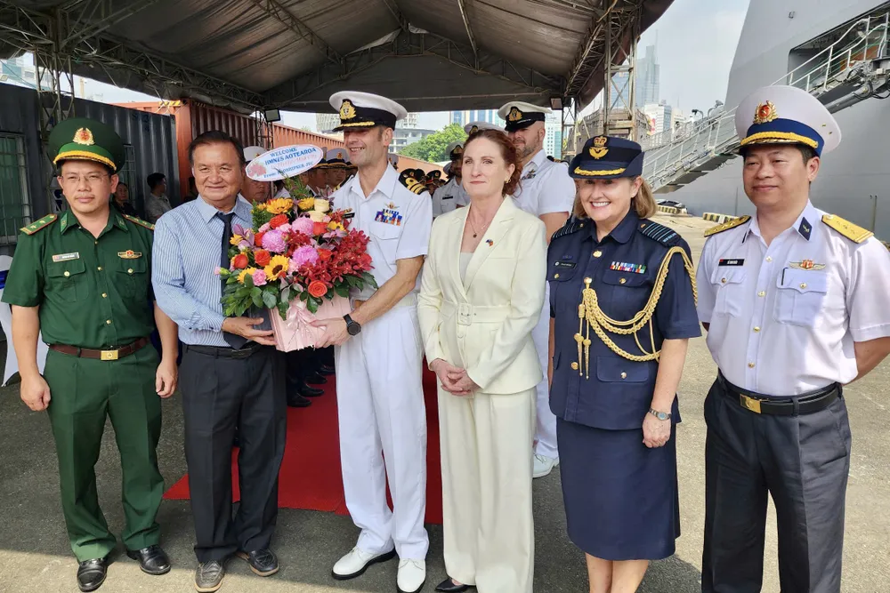 Đại diện Bộ Tư lệnh Vùng 2 Hải quân, Bộ Tư lệnh Quân khu 7, Sở Ngoại vụ TP.HCM và Cục Đối ngoại Bộ Quốc phòng đón tàu hậu cần HMNZS Aotearoa. Ảnh: BP