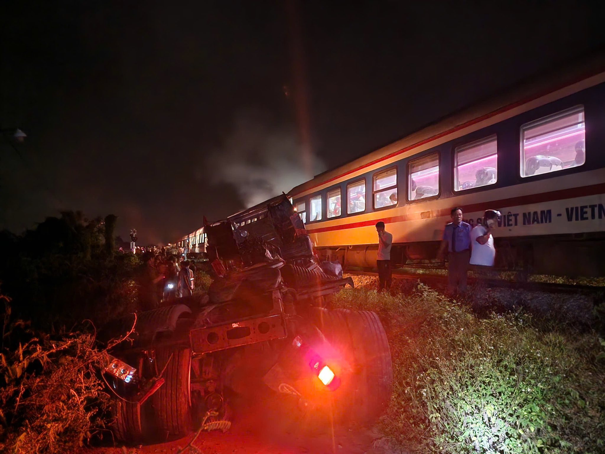 Dù đã cố gắng tìm cách xoay trở, tuy nhiên, đoàn tàu đã tông vào giữa xe đầu kéo khiến phần đầu và rơ-moóc bị tách rời, nằm cách xa nhau. Cabin xe văng ra ngoài, biến dạng, hư hỏng. Phần đầu tàu SE8 cũng bị hư hỏng nặng.
