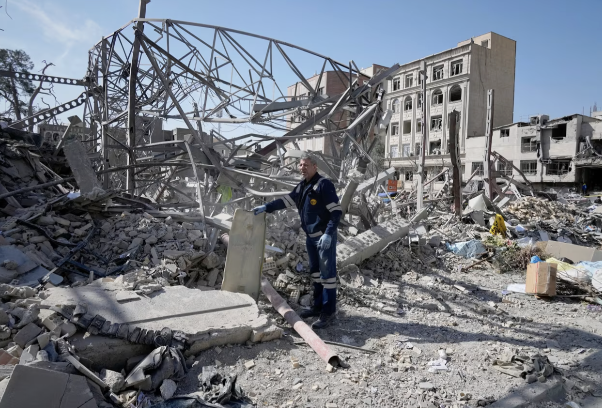 Công nhân điện lực kiểm tra đống đổ nát sau cuộc tấn công của Mỹ và Israel. (Ảnh: AP)