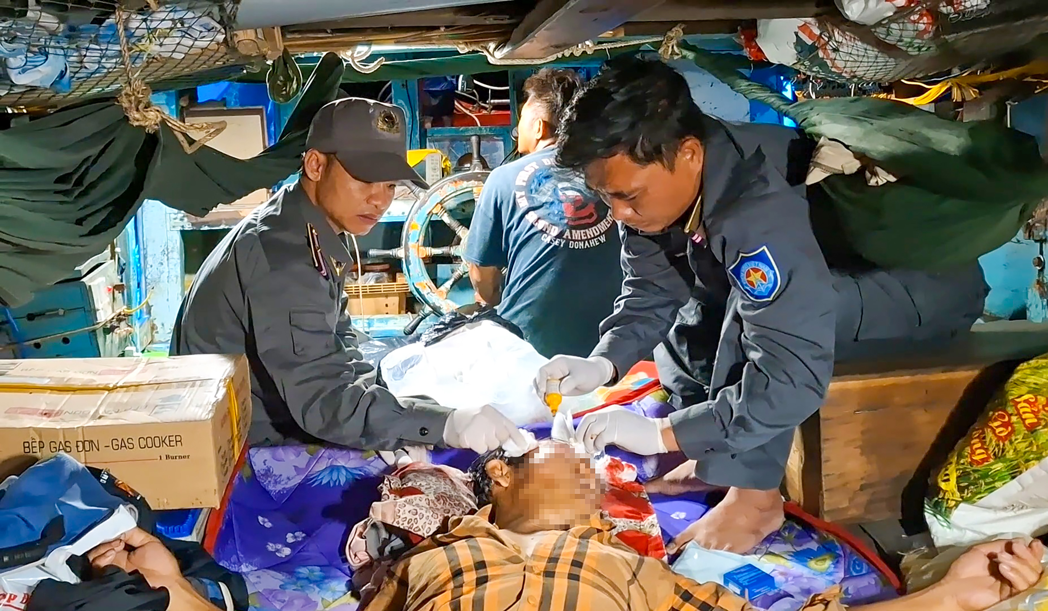 Tổ quân y tàu KN-219 đã nhanh chóng sát trùng, cầm máu, băng bó và cấp thuốc kháng sinh cho nạn nhân.