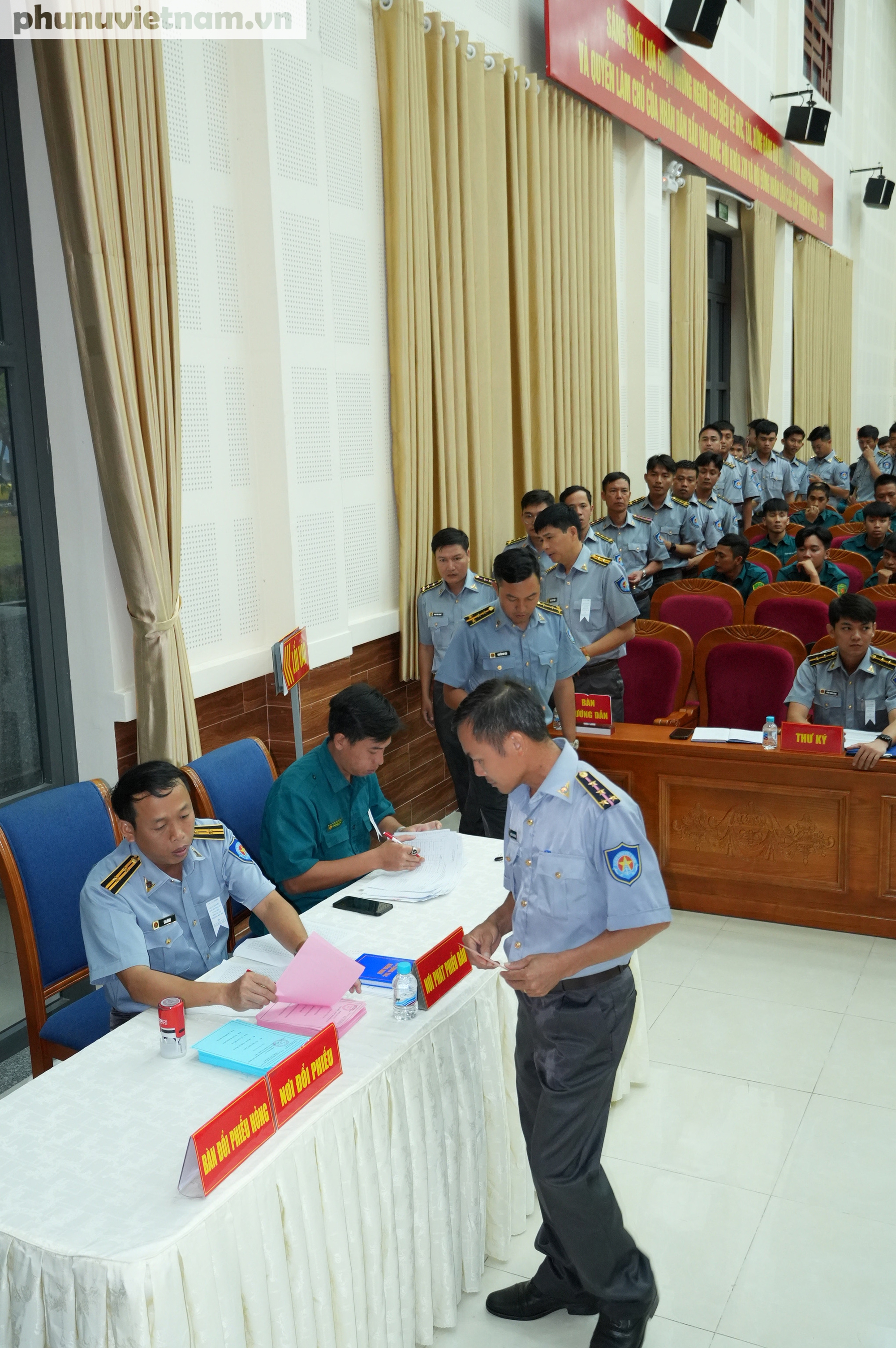 Điểm thứ nhất: Hội trường Hải đoàn 129, số 1451 đường 30/4. Tại đây, cử tri của Hải đoàn 128 và Hải đoàn 129 tham gia bỏ phiếu. Tính đến 11 giờ ngày 26/2, có 204/264 cử tri hoàn thành quyền bầu cử.