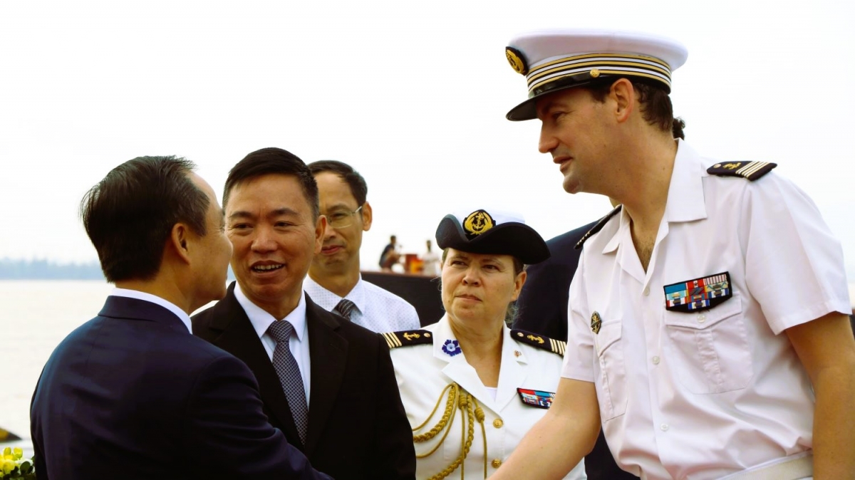 Trung tá Wallerand Faivre D’Arcier, Chỉ huy trưởng tàu tuần dương Prairial của Hải quân Pháp chào lãnh đạo Sở Ngoại vụ thành phố Đà Nẵng
