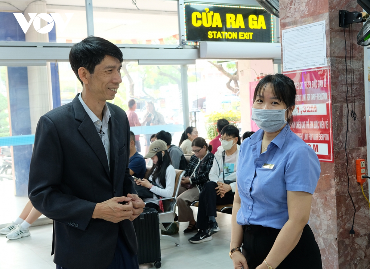 Ông Nguyễn Văn Hải, Phó trưởng ga Đà Nẵng trao đổi với nhân viên soát vé
