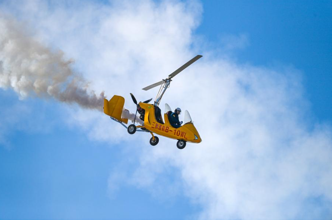 Một máy bay cánh quay (gyrocopter) biểu diễn tại một triển lãm ở Thiên Tân năm 2025, sự kiện quy tụ các công nghệ hàng không và mô hình kinh doanh thuộc lĩnh vực kinh tế tầm thấp của Trung Quốc. Ảnh: Xinhua