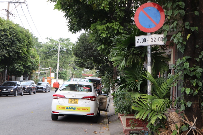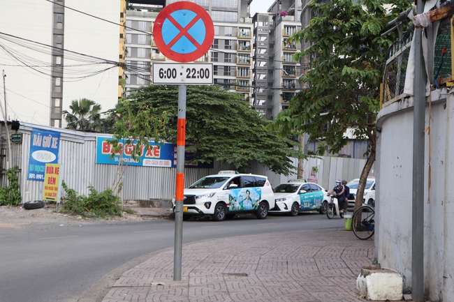 Theo ghi nhận ngày 16-12, đường Đặng Văn Sâm có biển báo "Cấm đỗ xe từ 6 - 22 giờ". Dù vậy, ô tô, taxi đến đây rồi bật xi-nhan để đỗ xe hàng giờ liền. Tình trạng này khiến lòng đường bị thu hẹp đáng kể.