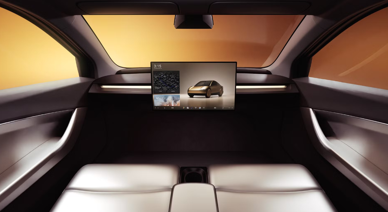 Bên trong Robotaxi tương lai của Tesla: Một màn hình lớn hiển thị thông tin chuyến đi và giải trí, cùng không gian nội thất tối giản, tập trung vào trải nghiệm hành khách.