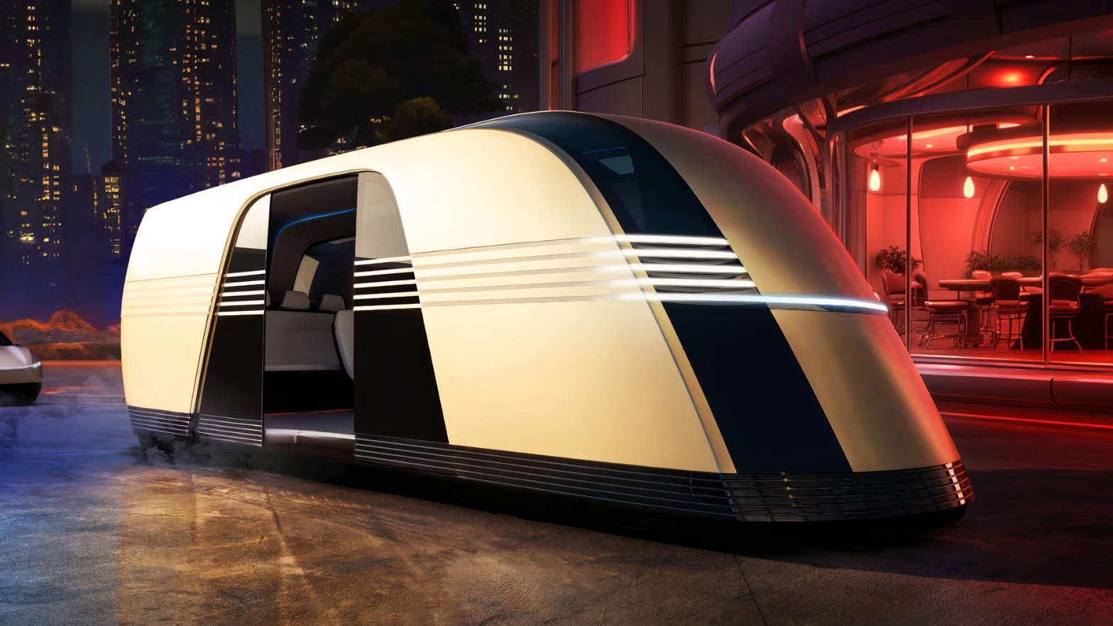 Thiết kế độc đáo của Cybercab/Robotaxi chuyên dụng của Tesla, với cửa mở rộng tiện lợi, mang đến không gian rộng rãi và dễ dàng ra vào cho hành khách.