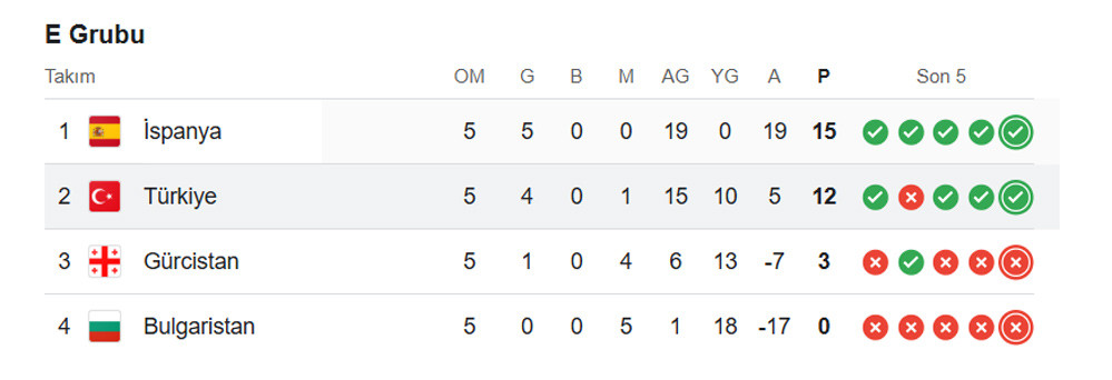 BXH bảng E vòng loại World Cup 2026 khu vực châu Âu qua 5 lượt trận. Giữa tuần tới, Tây Ban Nha sẽ có chuyến làm khách trên sân Thổ Nhĩ Kỳ