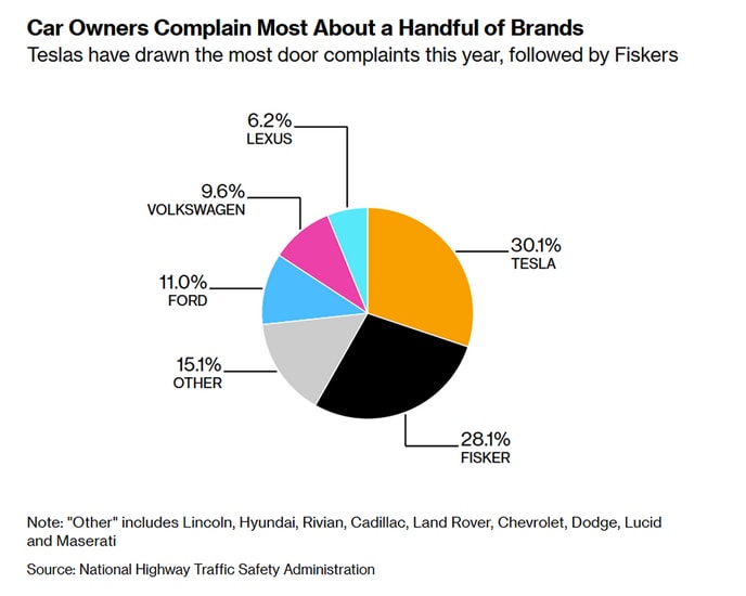 Là hãng xe tiên phong trong việc phổ biến tay nắm cửa điện, Tesla nhận được nhiều khiếu nại nhất và hiện là đối tượng của một cuộc điều tra an toàn tại Mỹ. Cuộc điều tra được công bố vào tháng 9, tập trung vào hơn 174.000 xe SUV Tesla Model Y. Trong 10 năm qua, NHTSA đã nhận được 210 khiếu nại liên quan đến cửa xe Tesla.